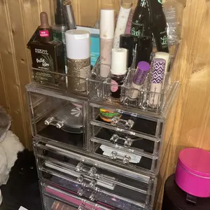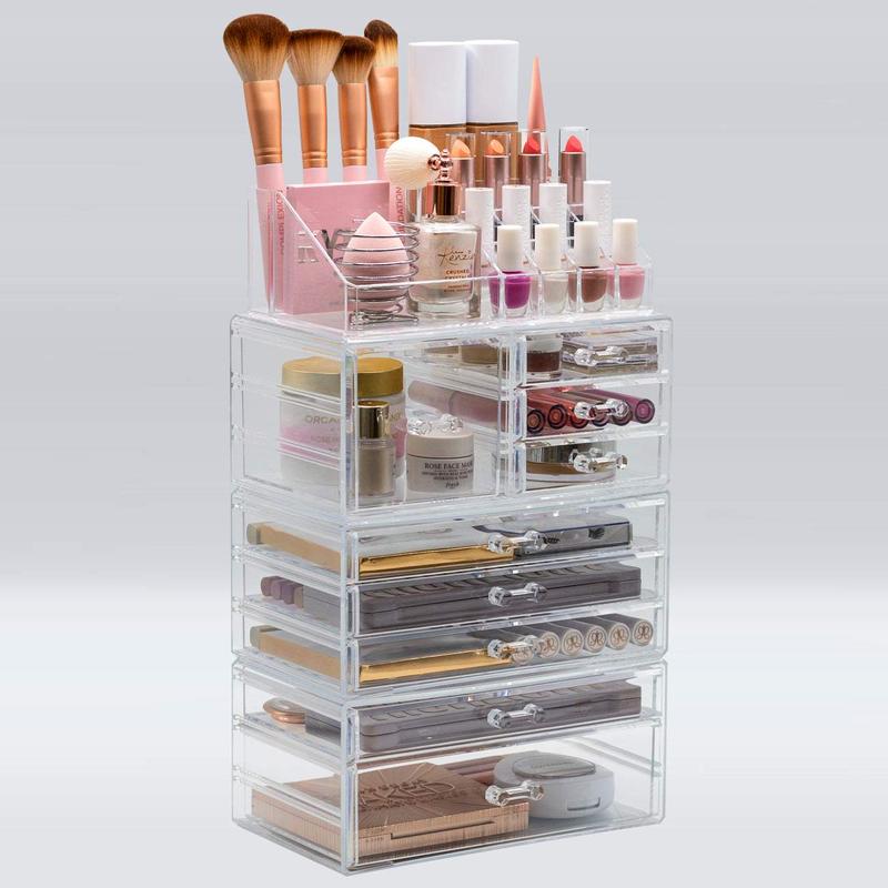 Organize your beauty essentials with this spacious and stylish X-Large Clear Makeup Organizer Case. This 4-piece set features 9 drawers, including a top tray with 16 divided slot compartments, making it perfect for storing cosmetics, skincare, jewelry, and accessories.