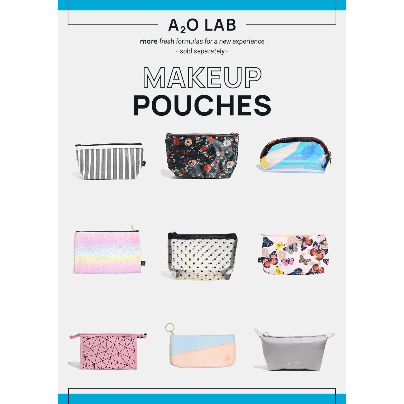 Live clutter-free with a2o Lab Makeup Pouches. These travel MVPs come in 12 cute designs. Stylish + perfect for your on-the-go needs!