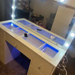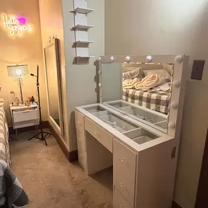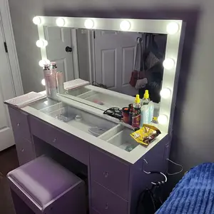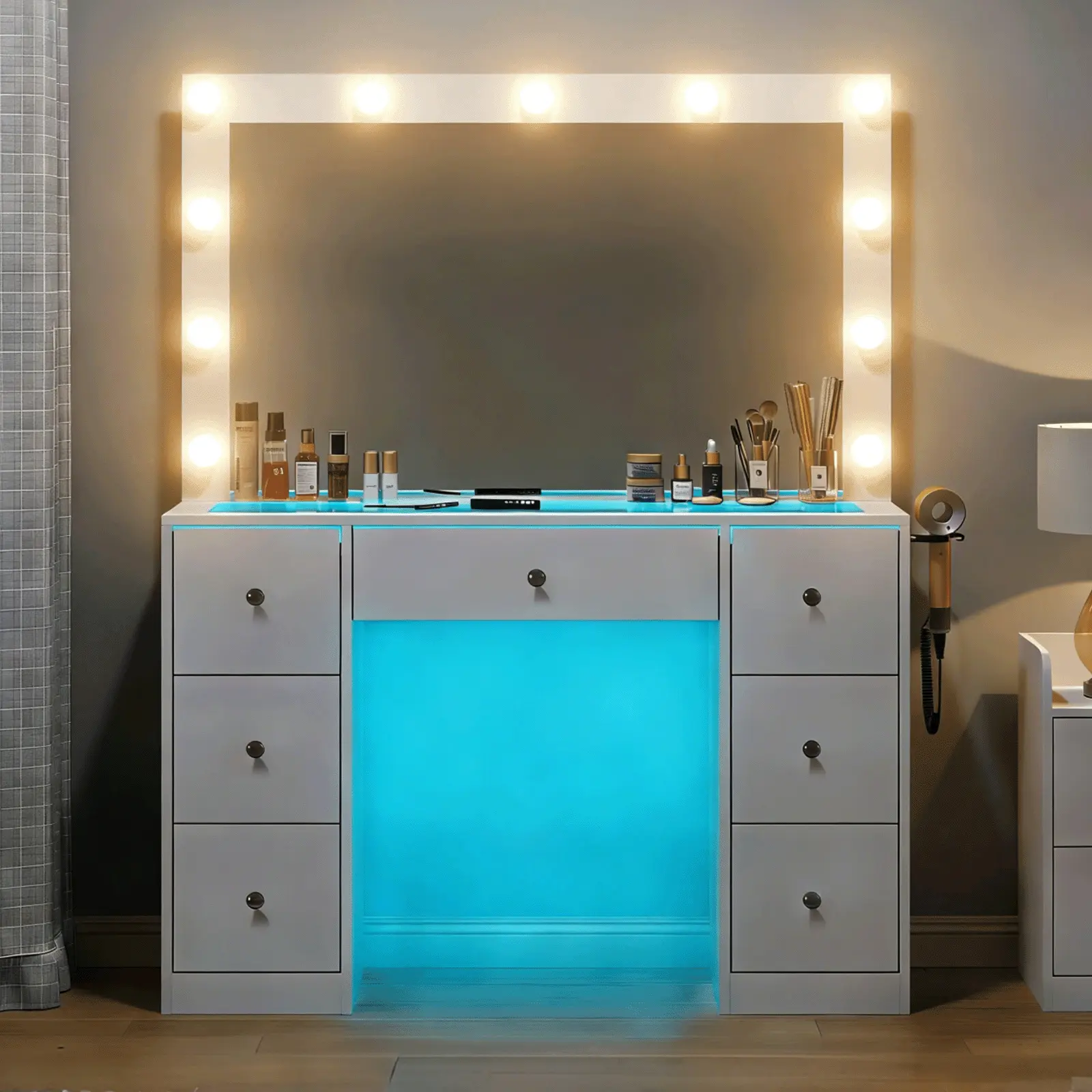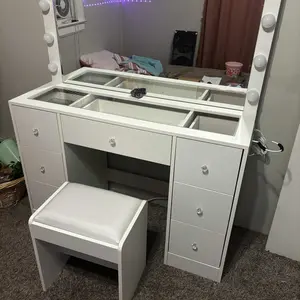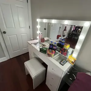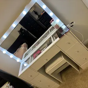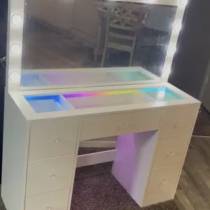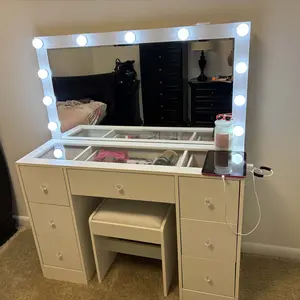 11 Adjustable Lights: The vanity table features a large mirror surrounded by 11 lights. Easily switch between three color modes and adjust the brightness