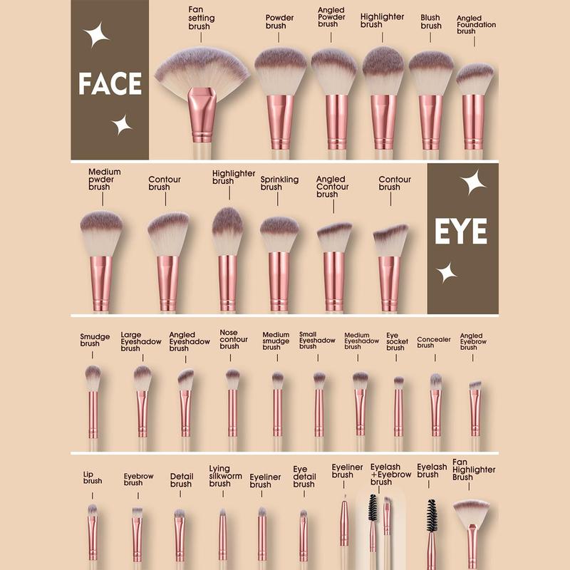 Son 32 brochas masomenos la calidad hace justicia al precio, la bolsa es bonita y amplia para todo tu maquillaje.