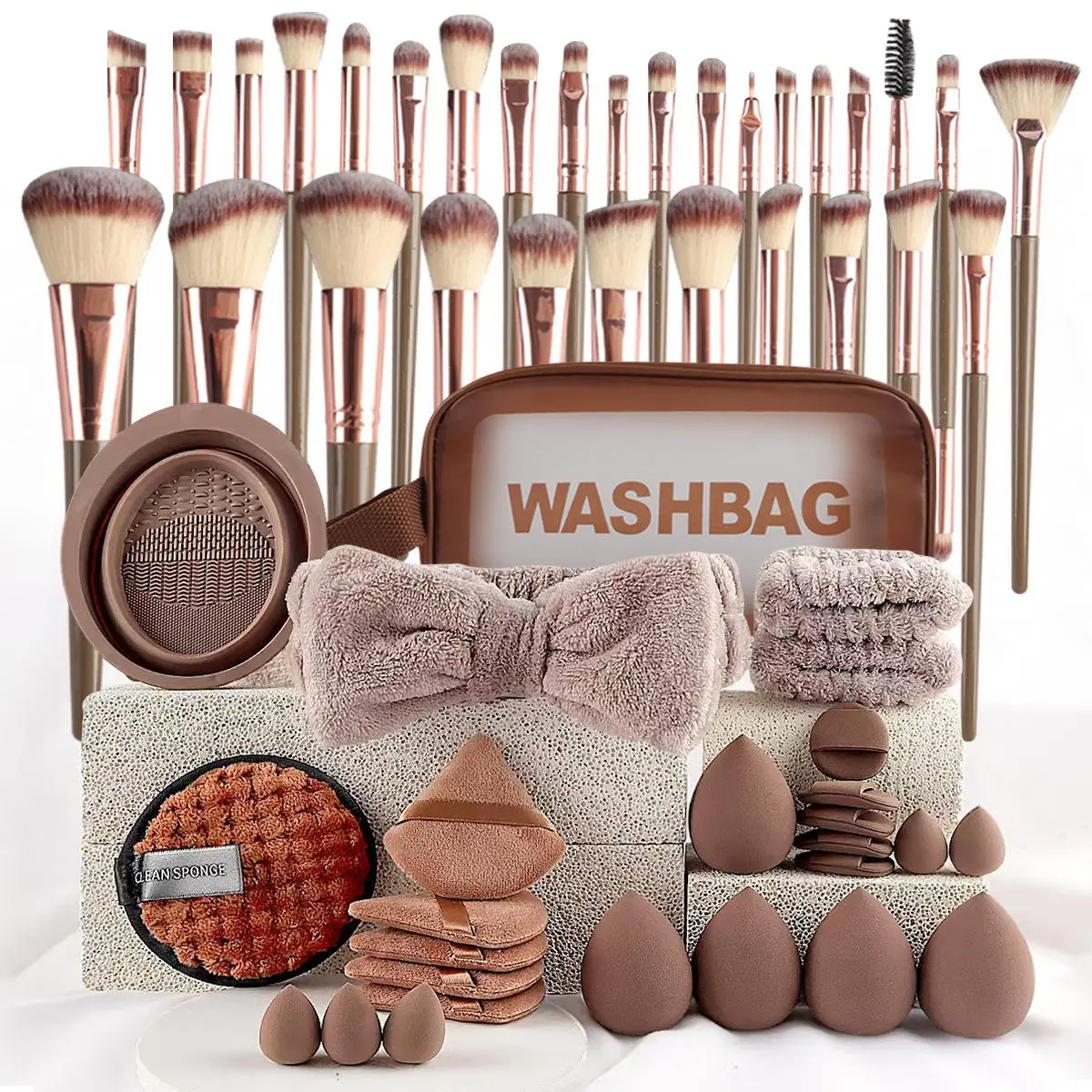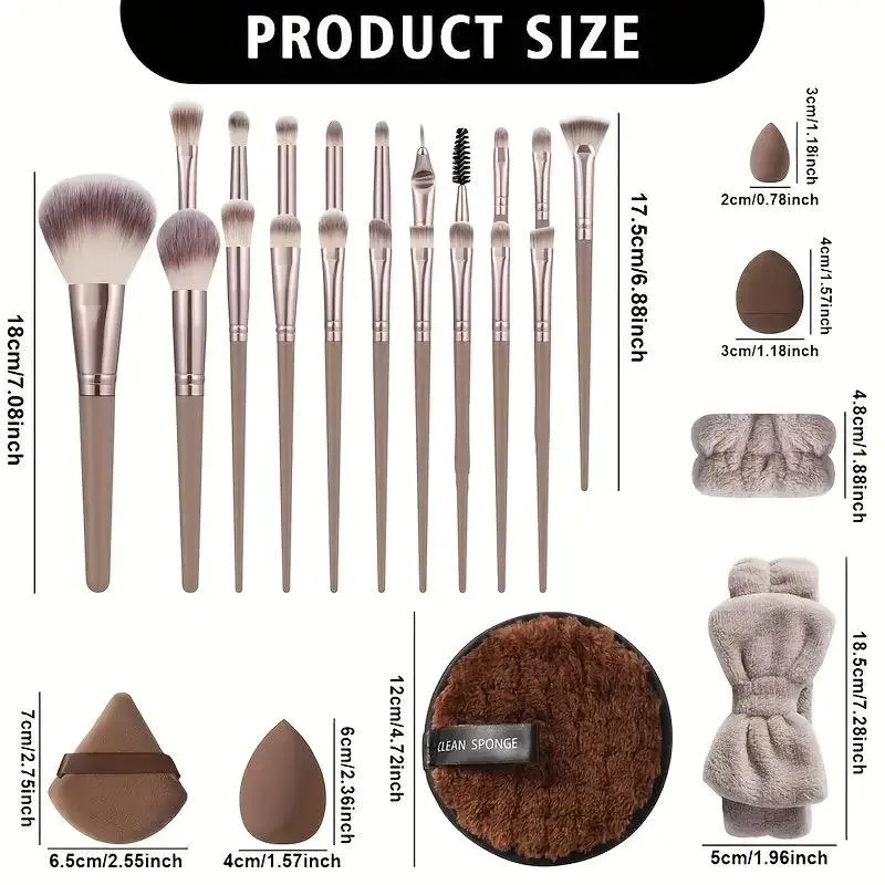 a portable brush kit in a single compact tube key components, large face brushes usually includes a fluffy powder, brush, and a slanted foundation or blush brush, small detail brushes features a dual eye area tool with a smudge brush and then eyesViral with hair ties and headband as well
