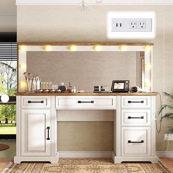 ·[Built-in Charging Station] The vanity dresser includes a built-in charging station with 2 AC outlets and 2 USB ports, allowing you to conveniently use your hair dryer, curling iron, or mobile devices simultaneously, ensures that you stay powered up while enjoying your beauty routine