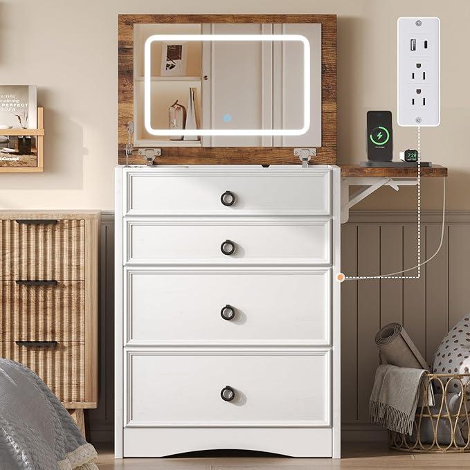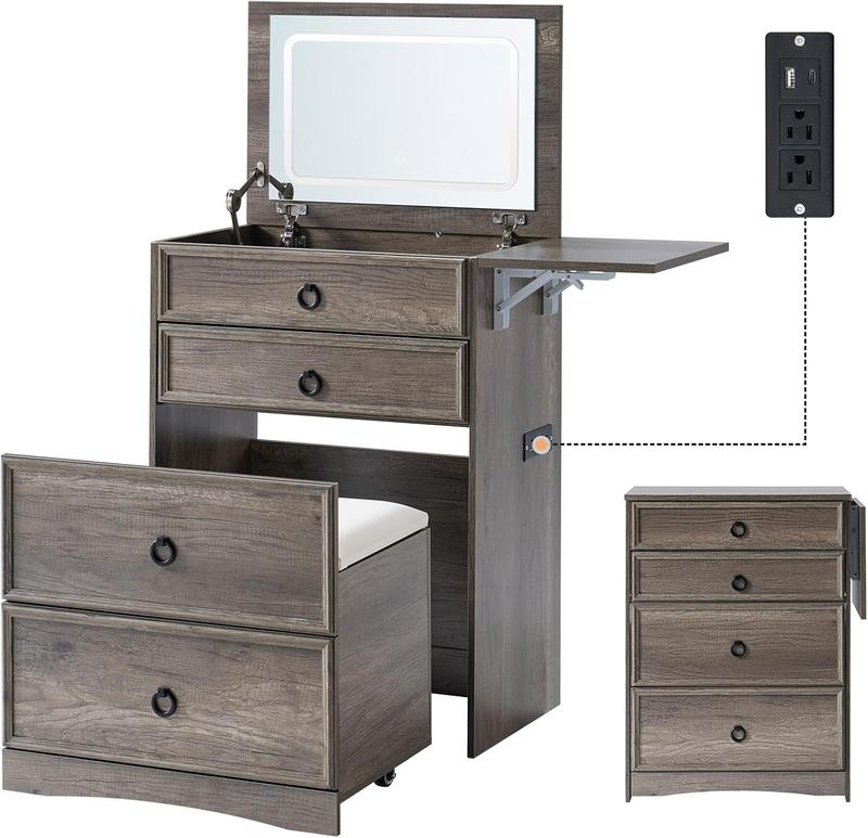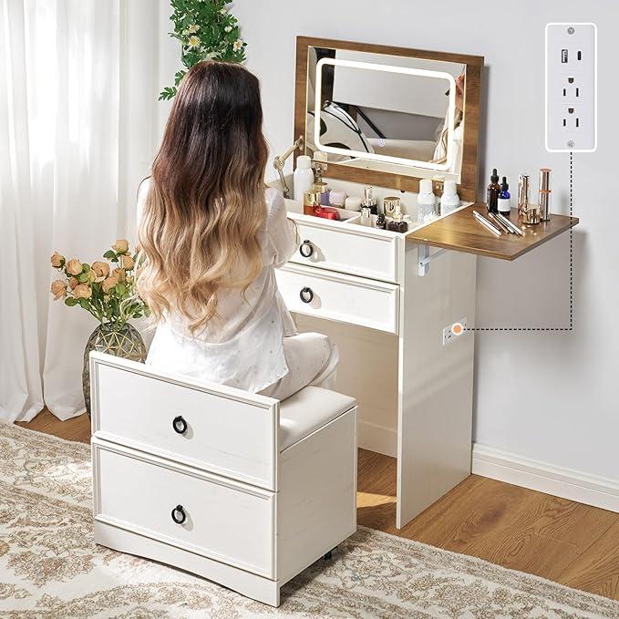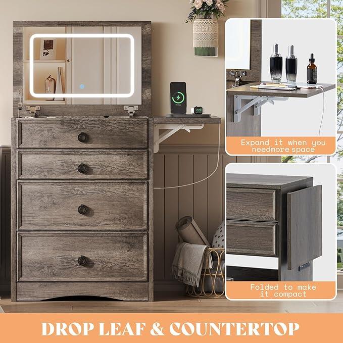 [Smart Space Utilization] Spacious top compartment, hidden drawer, and fold-out side panel for additional storage. Folds back to save space, ideal for compact rooms. Built-in charging station for device charging while you get ready