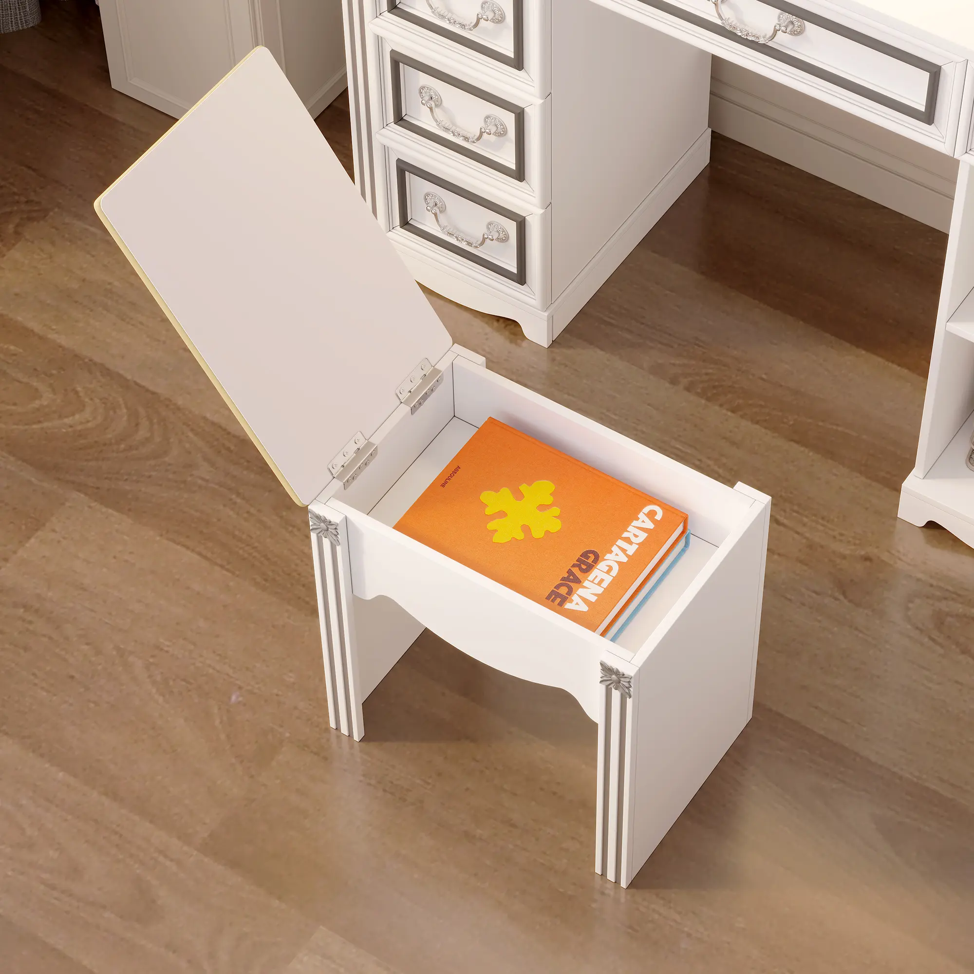 This makeup vanity is equipped with charging station, with 1USB + 1 TYPE-C ports, light button, 2ac outlets, which can be used more conveniently to connect your hair dryer, phone, tablet.