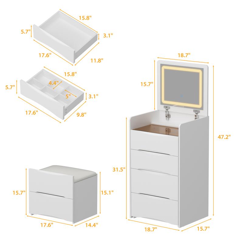 ·[Dressing Table with Vanity Mirror] - Hitow dressing table comes with a flip-up lighted mirror, allows you to check your exquisite makeup at any time. With several storage space and pull-out stool, the space-saving 3 in 1 dressing table could make you finish everday skincare or makeup routine smoothly and in comfort. Overall dimensions: 15.7"D x 18.7"W x 31.5"H