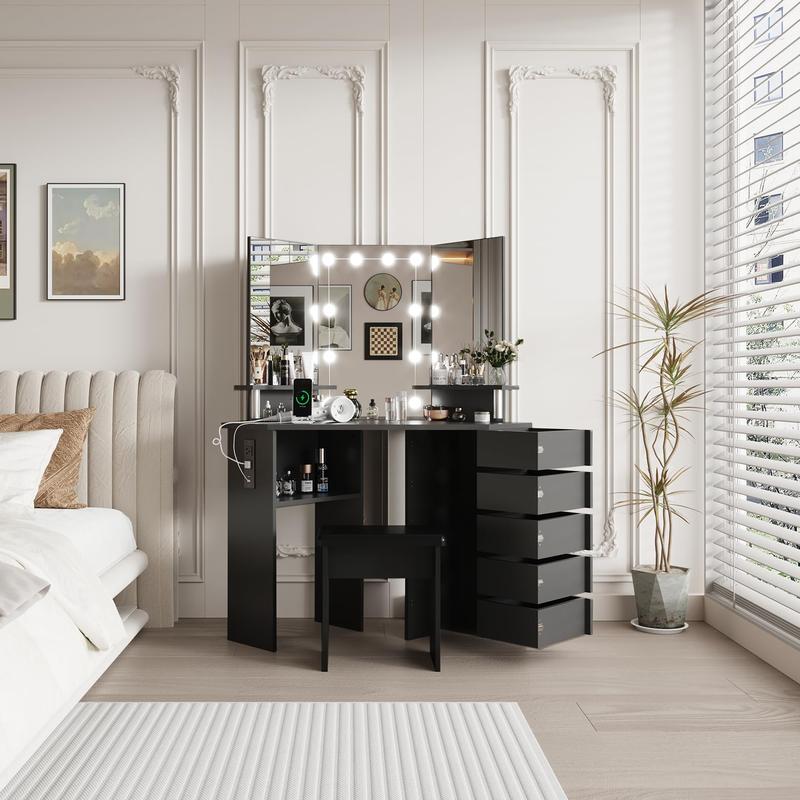 【GARVEE】Corner Makeup Vanity Desk with Lights & Power Outlet - Spacious Tri-Folding Mirror, Adjustable Brightness, 5 Rotating Drawers, Ample Storage, Stool Included【GARVEE】Corner Makeup Vanity Desk with Lights & Power Outlet - Spacious Tri-Folding Mirror, Adjustable Brightness, 5 Rotating Drawers, Ample Storage, Stool Included【GARVEE】Corner Makeup Vanity Desk with Lights & Power Outlet - Spacious Tri-Folding Mirror, Adjustable Brightness, 5 Rotating Drawers, Ample Storage, Stool Included【GARVEE】Corner Makeup Vanity Desk with Lights & Power Outlet - Spacious Tri-Folding Mirror, Adjustable Brightness, 5 Rotating Drawers, Ample Storage, Stool Included
