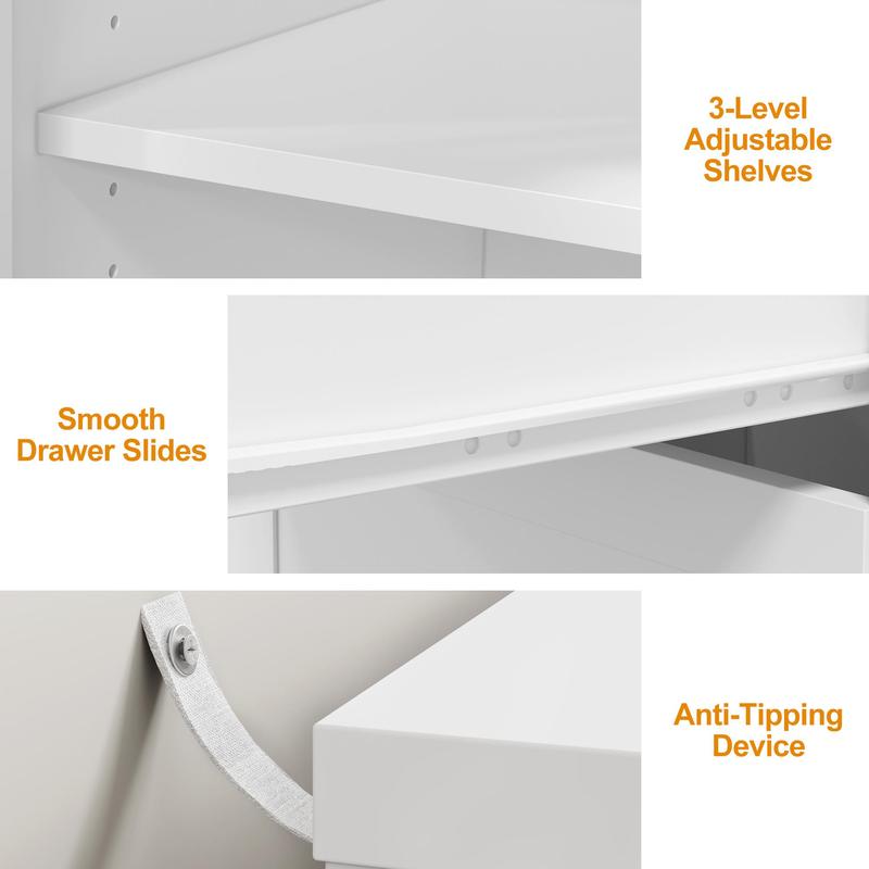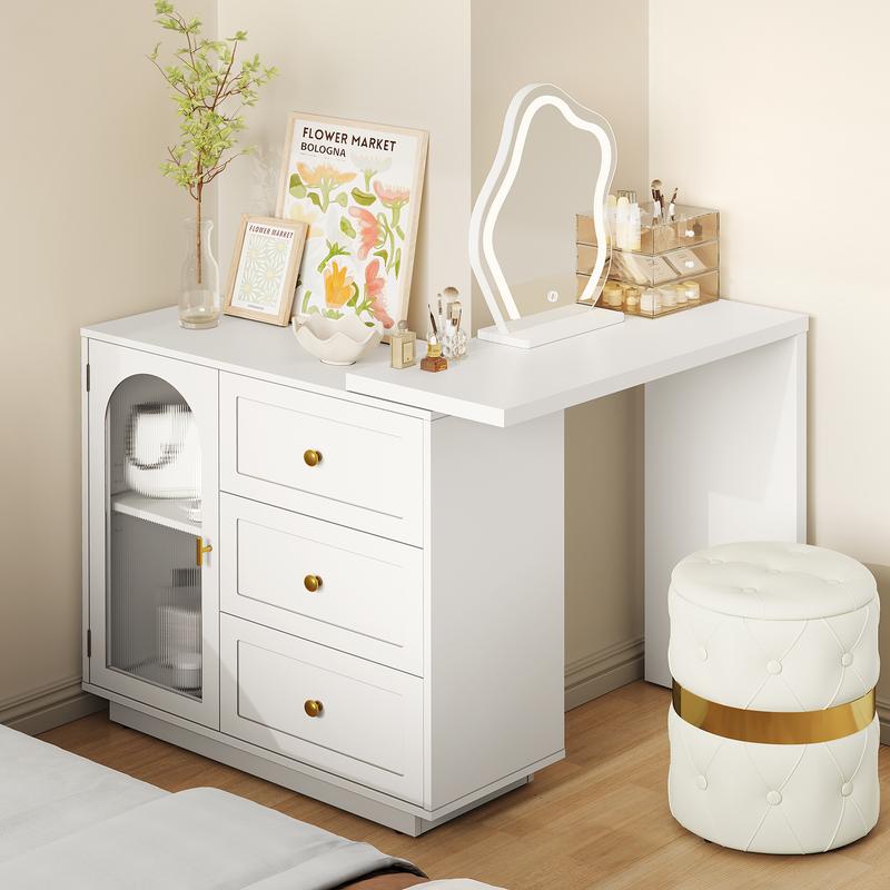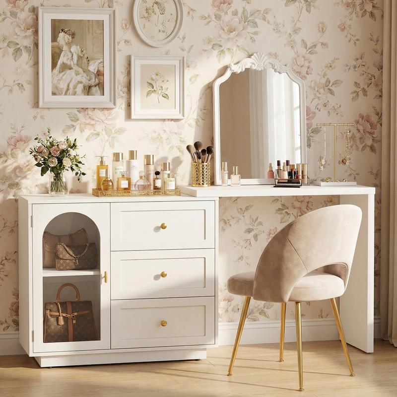 ·Multifunctional Storage: This vanity and dresser combo is equipped with 3 spacious drawers and a sleek 1 door side cabinet, offering ample storage space. The adjustable shelf inside the side cabinet allows you to customize the space to store larger items or frequently used accessories. Whether it's beauty products, jewelry, or personal items, everything stays organized, keeping your countertop neat and enhancing convenience.
