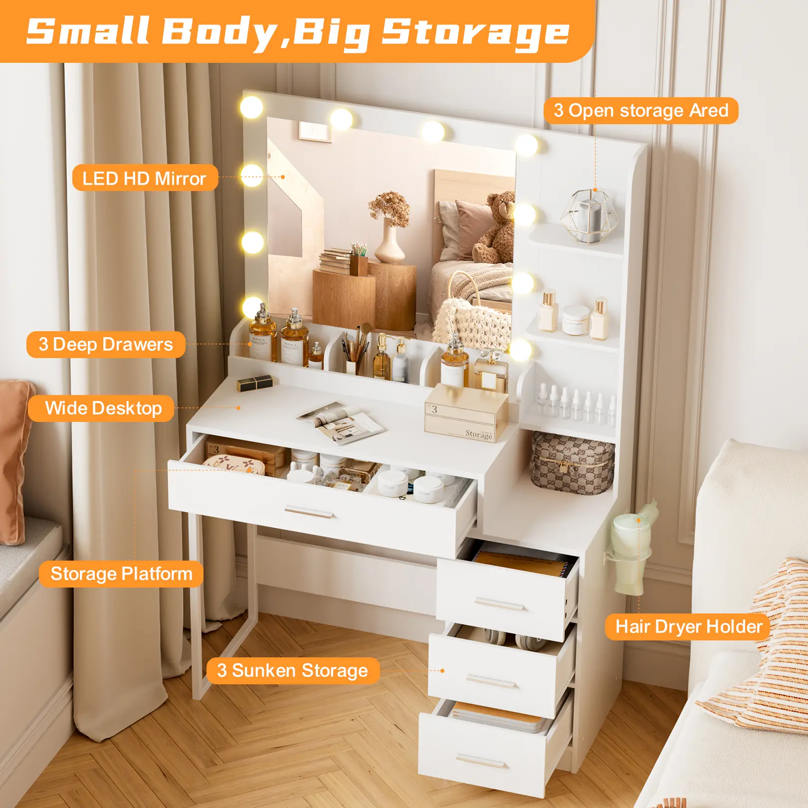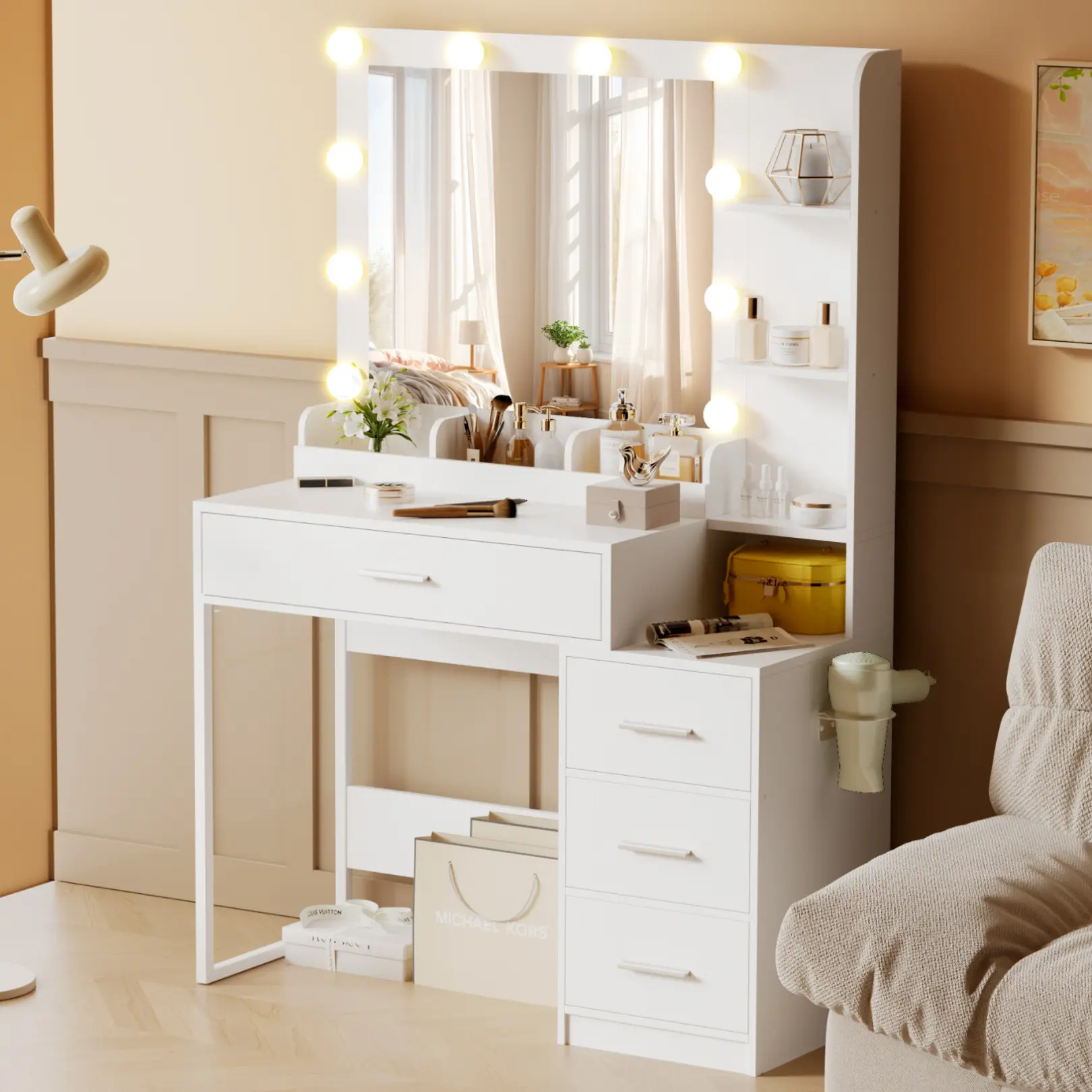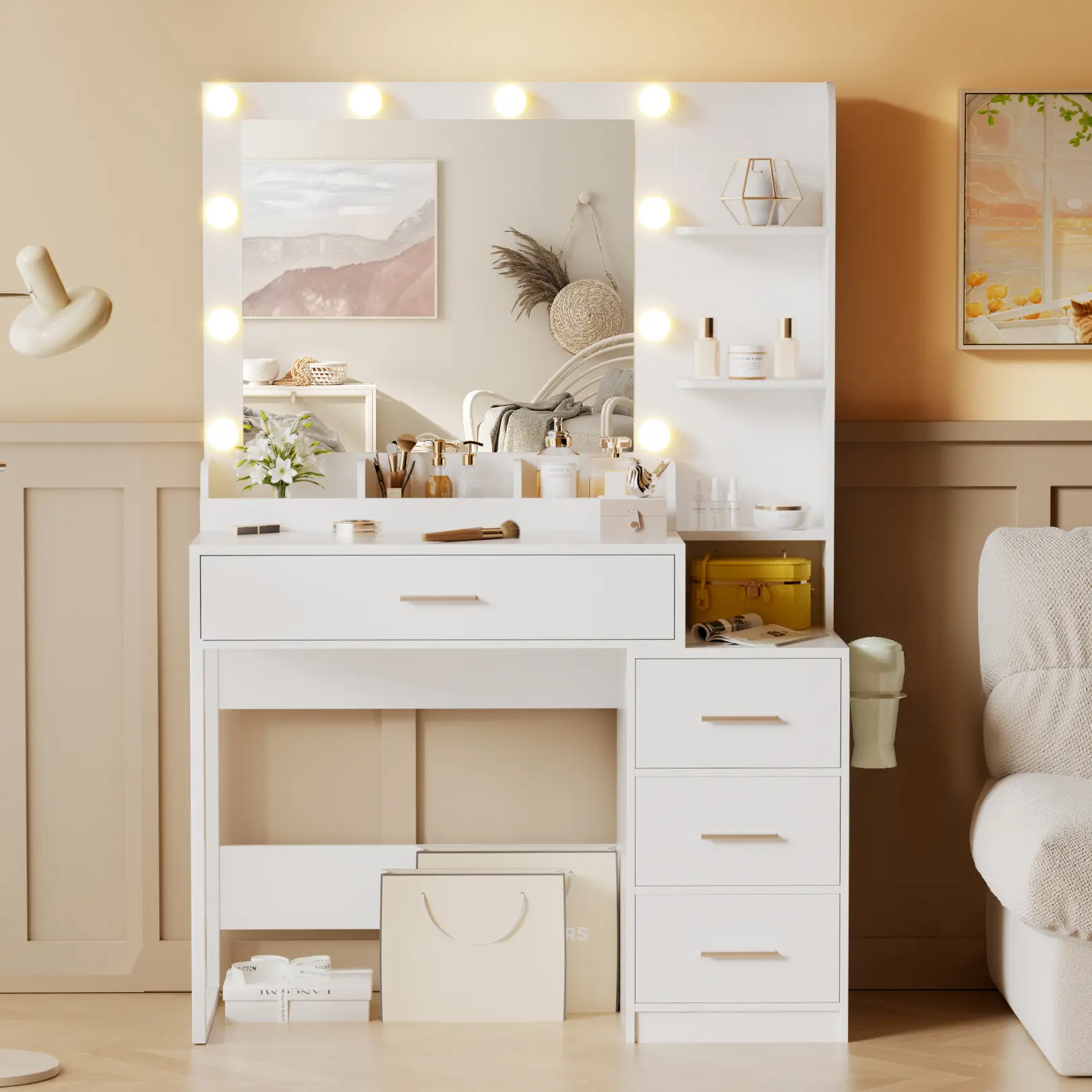 ·Ultimate Storage SolutionWith 4 spacious drawers, 3 open shelves, and a cabinet, this vanity provides practical storage for your cosmetics, jewelry, and accessories. Stay organized and clutter-free with everything at your fingertips!