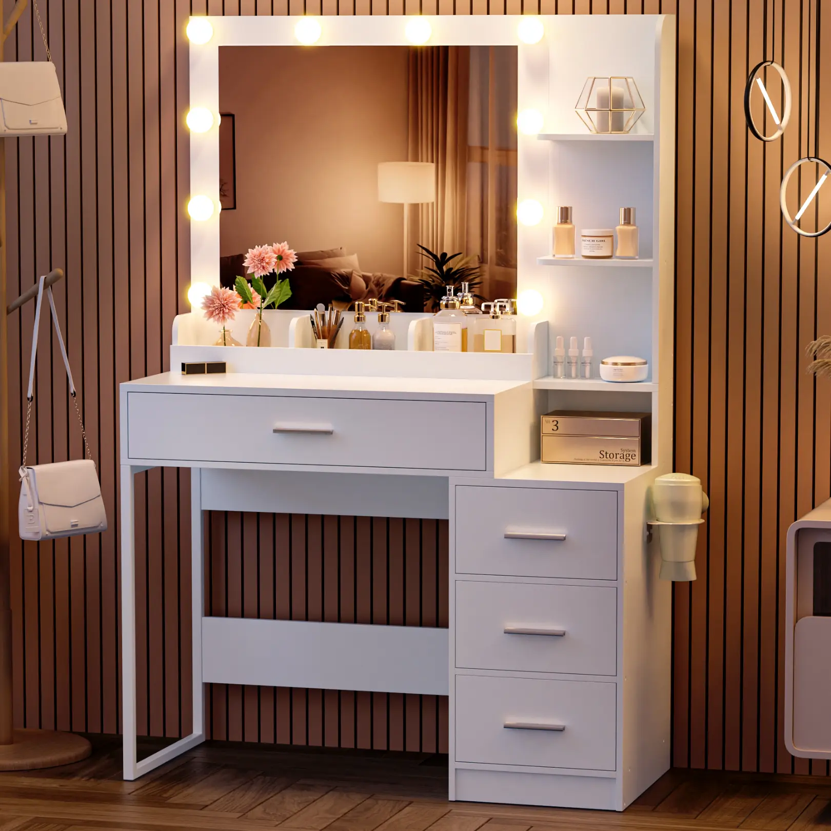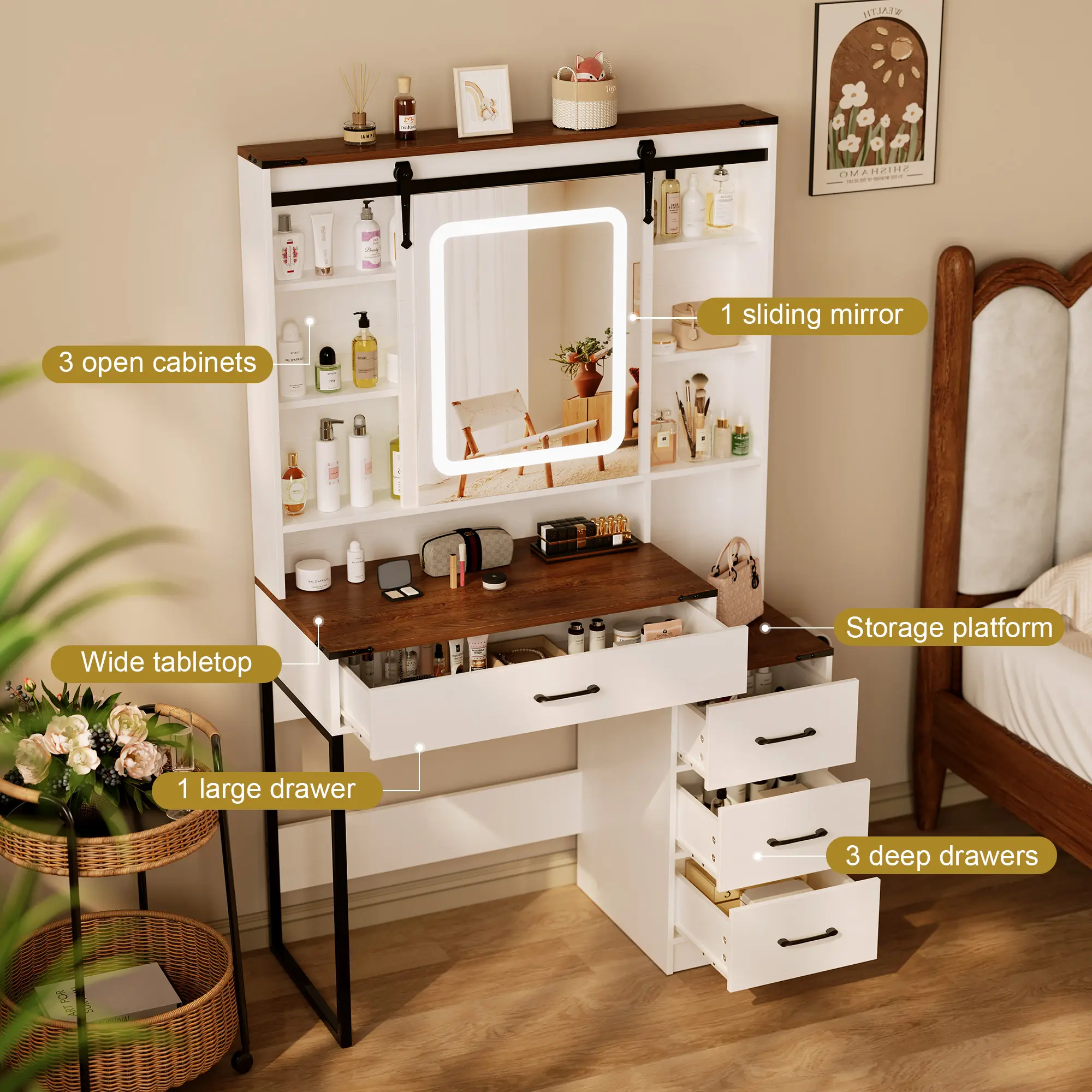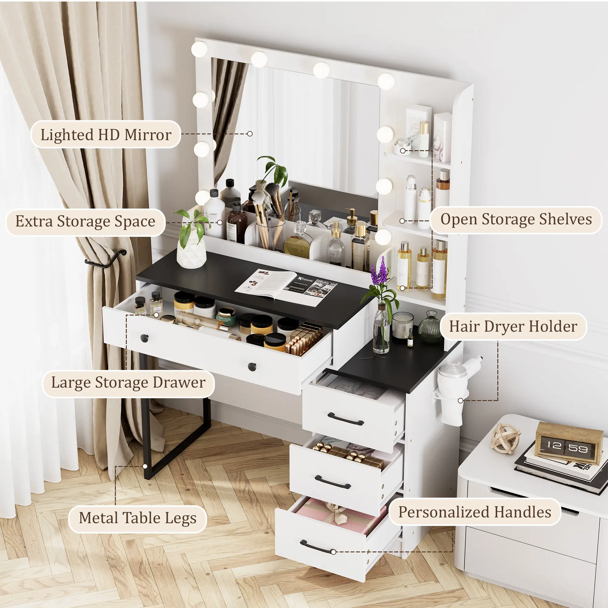 ·Ultimate Storage SolutionWith 4 spacious drawers, 3 open shelves, and a cabinet, this vanity provides practical storage for your cosmetics, jewelry, and accessories. Stay organized and clutter-free with everything at your fingertips!