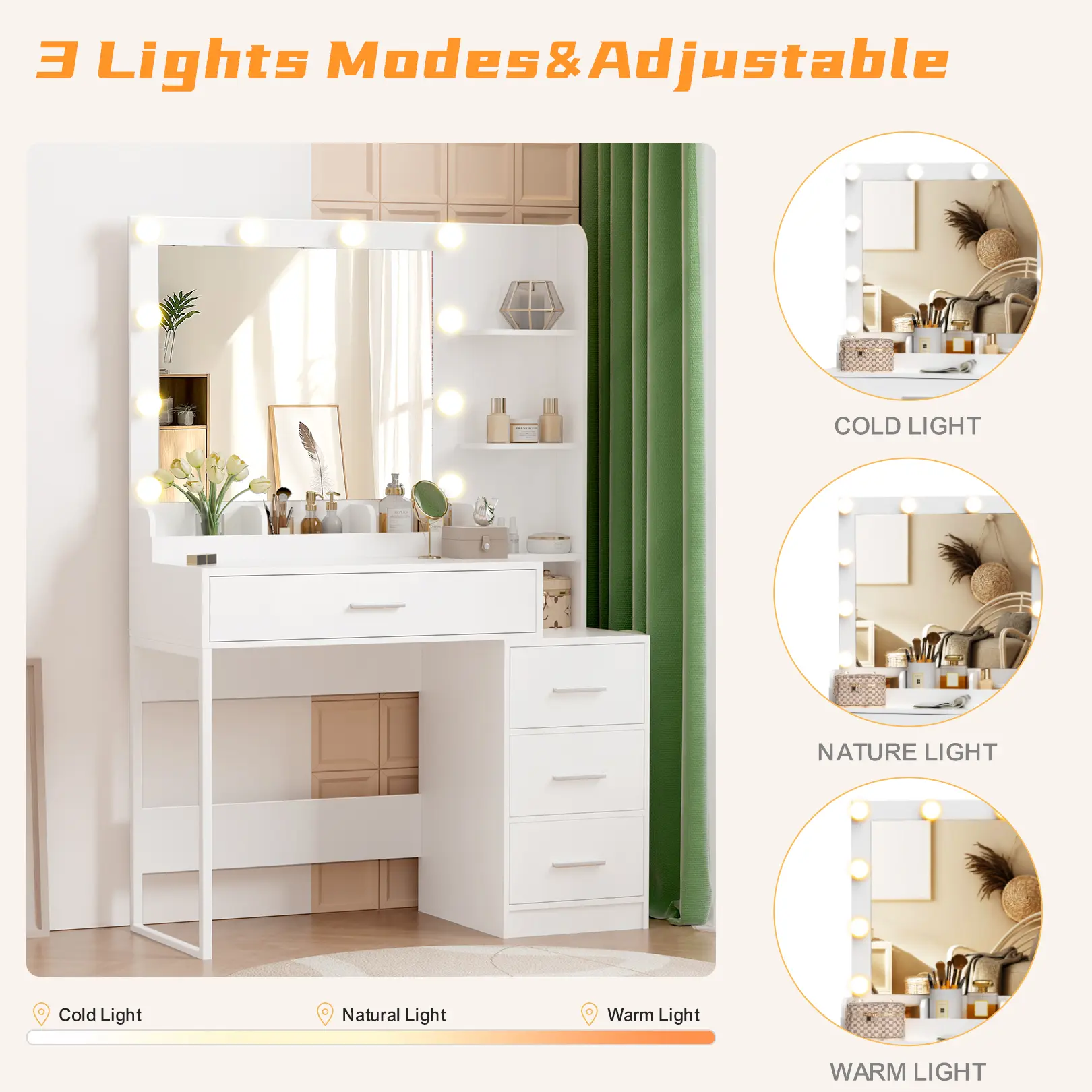 ·Brighten Your Beauty RoutineOur Makeup Vanity Desk features a large, movable mirror with adjustable tri-color LED lighting (cold, warm, natural) to match your makeup needs. Whether you’re prepping for a day at work or a night out, you’ll always have the perfect lighting!
