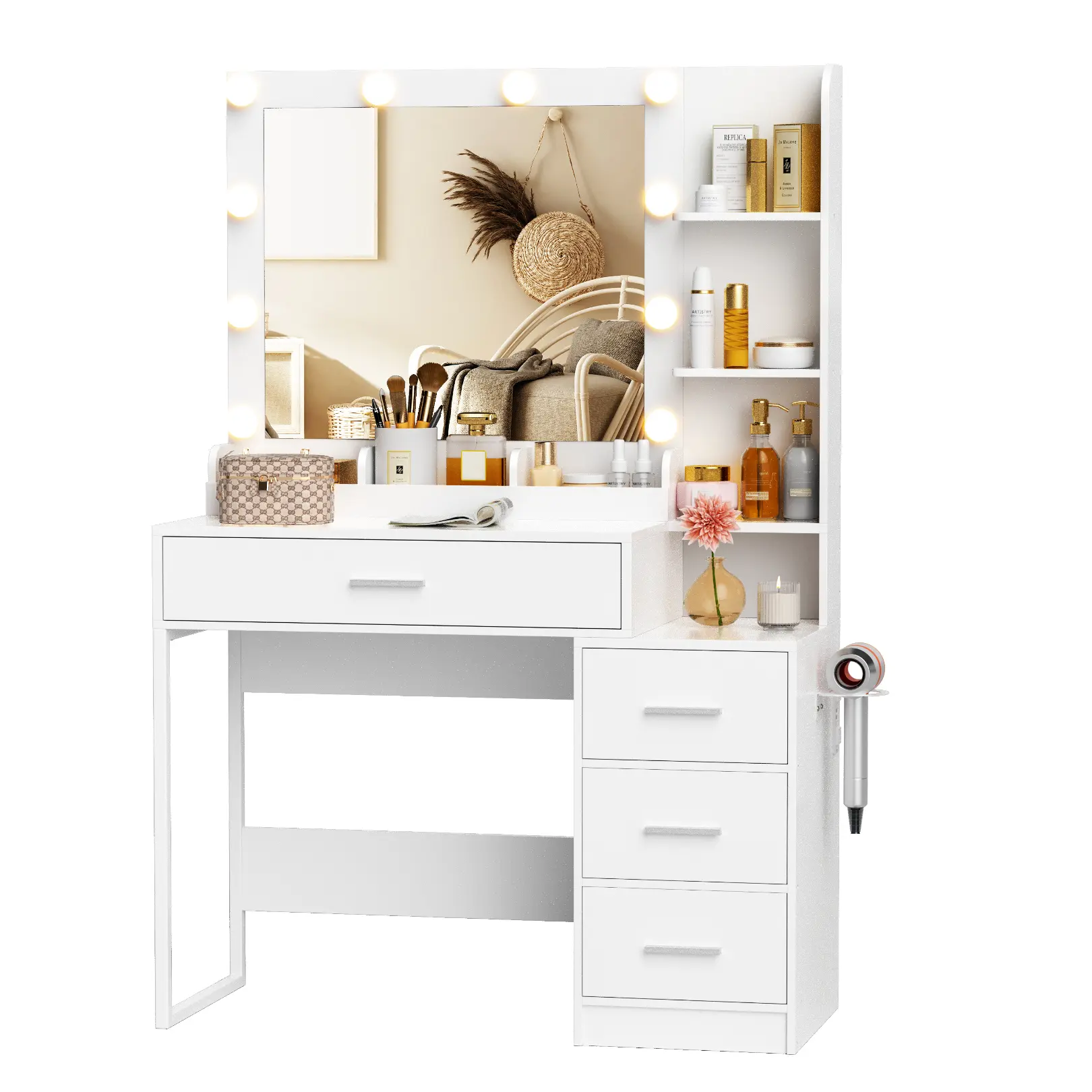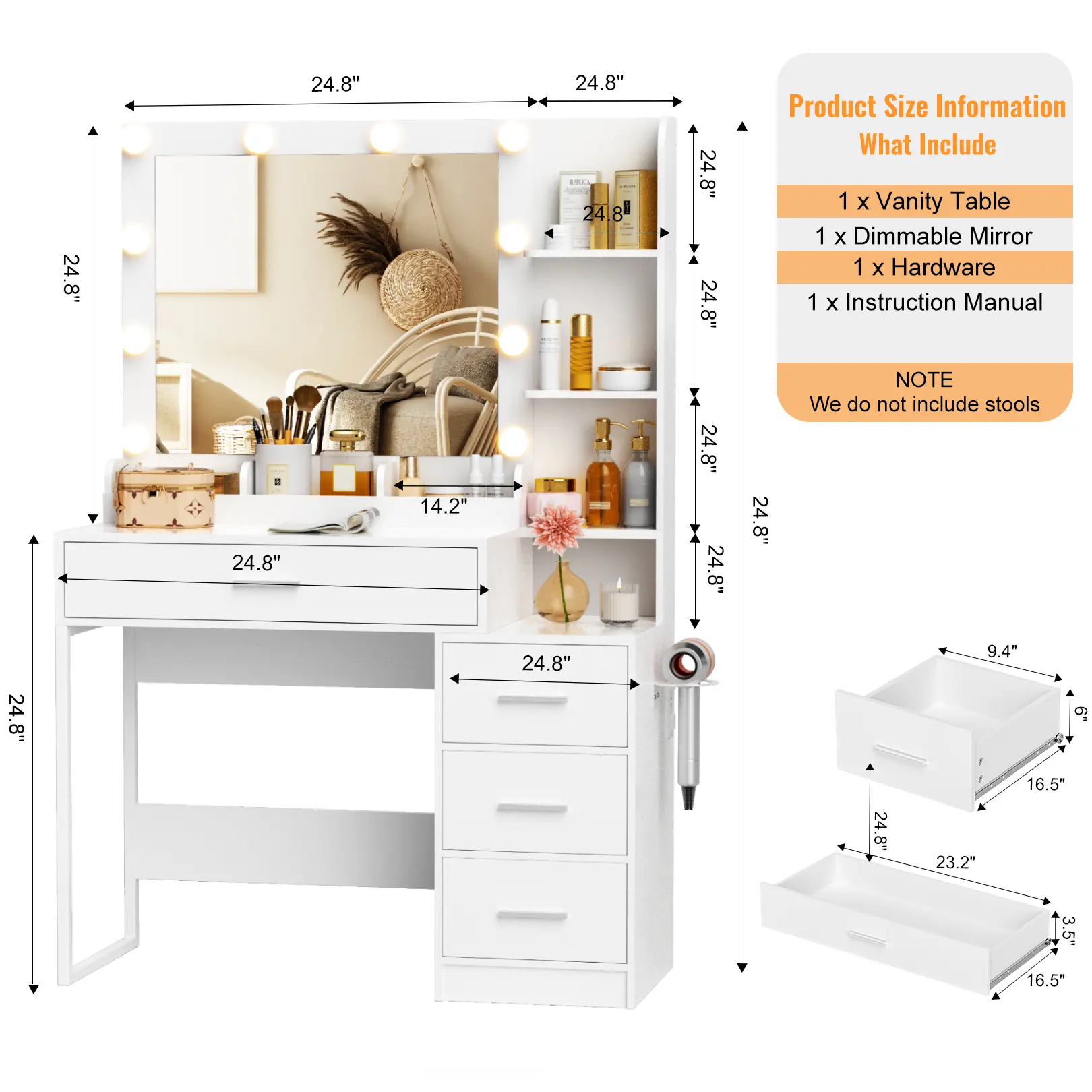 ·Convenient Charging StationEquipped with 2 AC outlets and 2 USB ports, this vanity makes it easy to charge your phone, tablet, or any device while you sit comfortably. Plus, it includes an adjustable hair dryer stand for ultimate convenience!