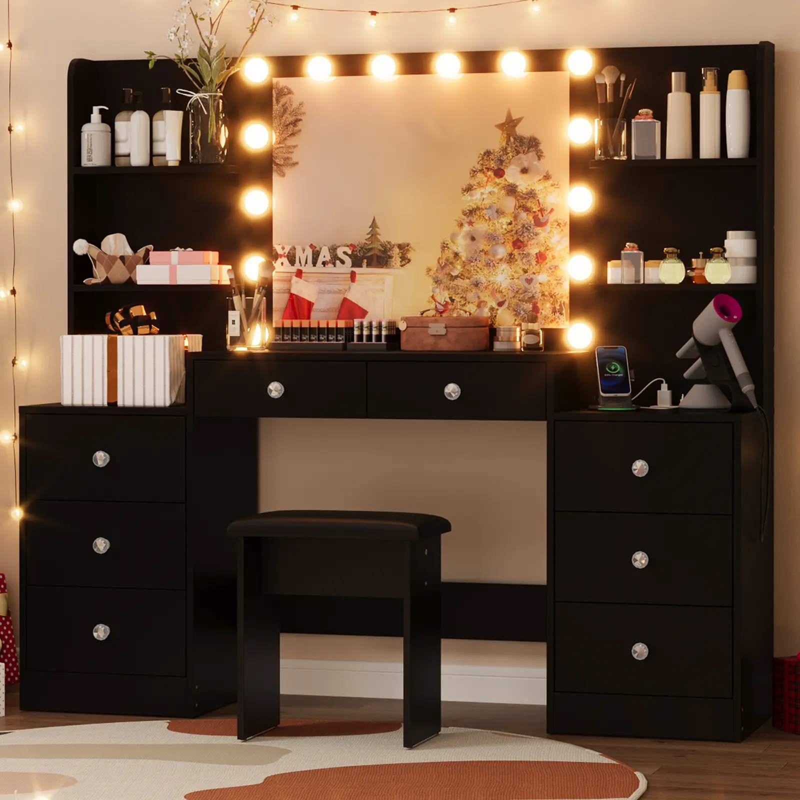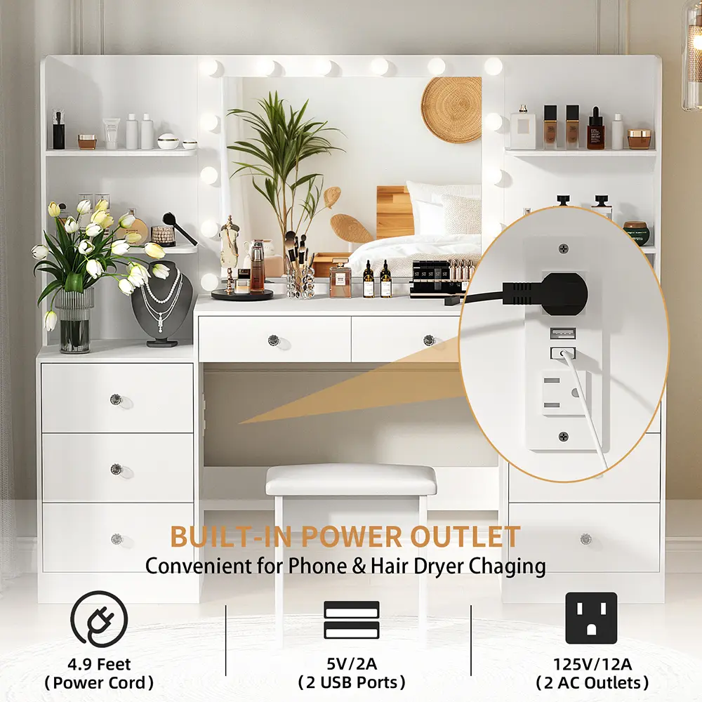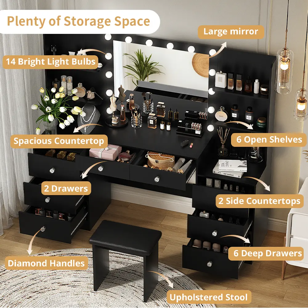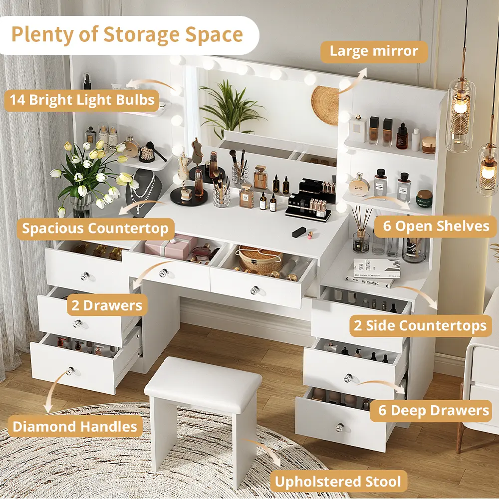AMAZING STORAGE SPACE: A dream vanity, with 8 drawers and 4 shelves with plenty of space,it can perfectly hold all your cosmetics and jewelry without clutter, making your daily beauty routine easier and faster.