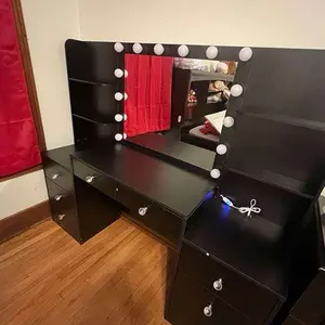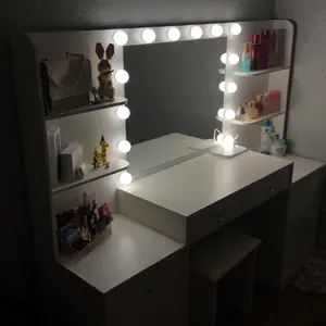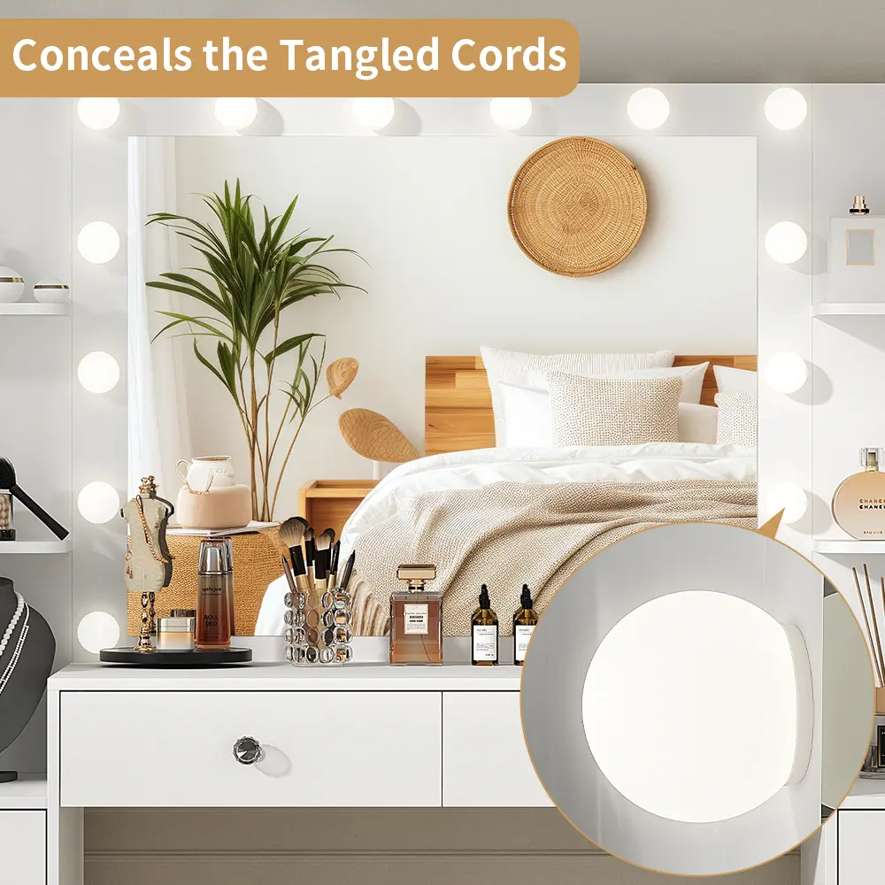 PERFECT LIGHTING: This modern vanity is equipped with 14 high quality LED bulbs with no exposed wires, providing good lighting for your makeup, hair styling, photo shoots or video production. In addition, you can freely adjust the light color and brightness to meet different makeup needs: daily makeup, OL makeup or date makeup. 3 color light settings: warm yellow, warm white and cool white.