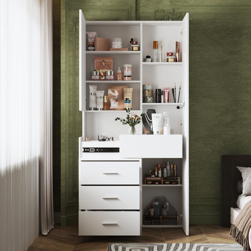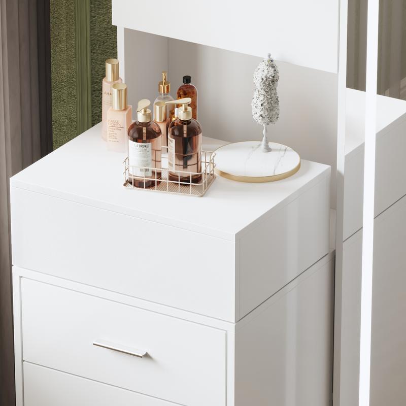 ·[Vanity with Full-length Mirror] - Hitow vanity comes with a full-length lighted mirror, allows you to check your exquisite makeup and stylish outfit at any time. With several storage space and sliding tabletop, the 3 in 1 vanity cabinet could make you finish everday makeup or dressing routine smoothly and in comfort. Overall dimensions: 13.8"D x 31.5"W x 63"H