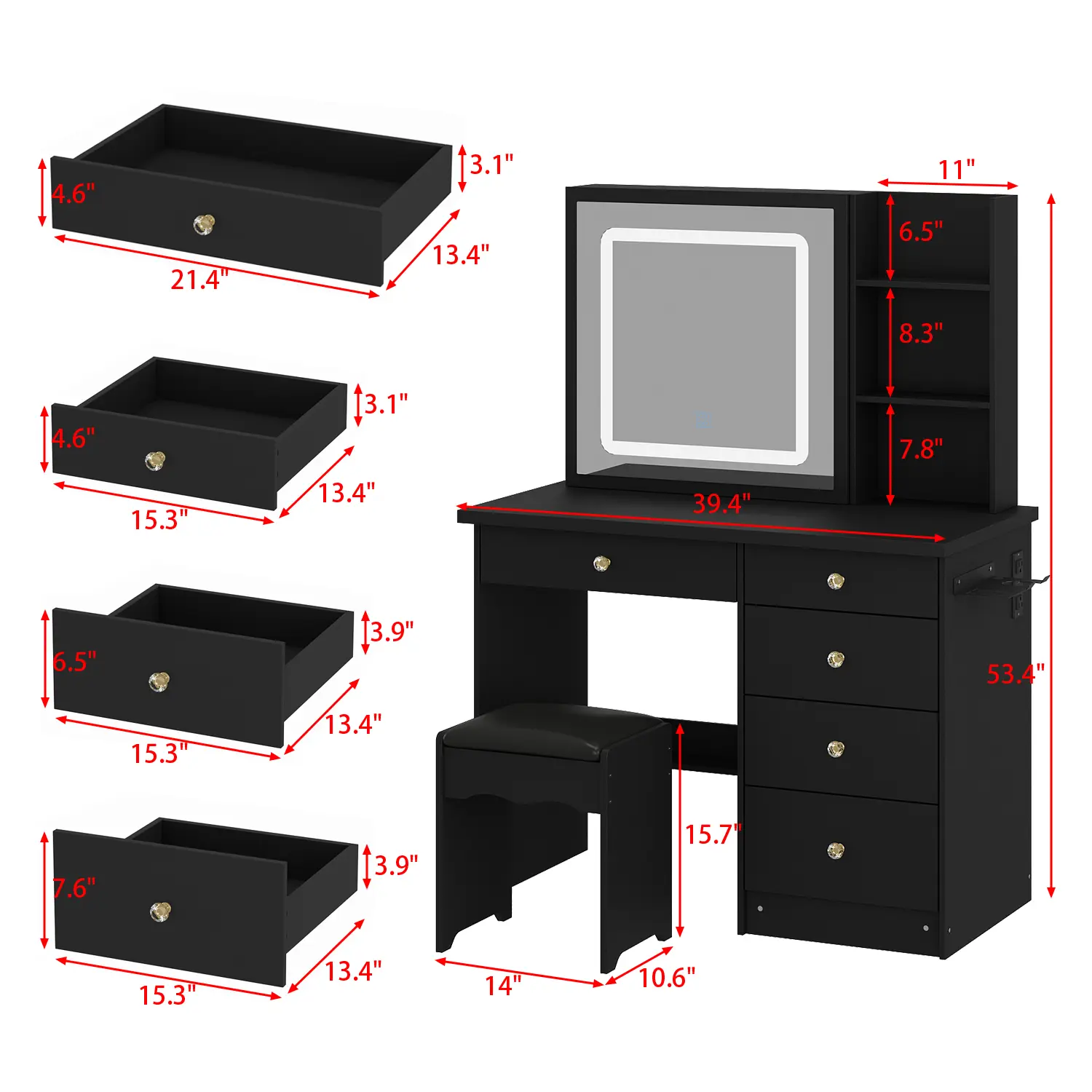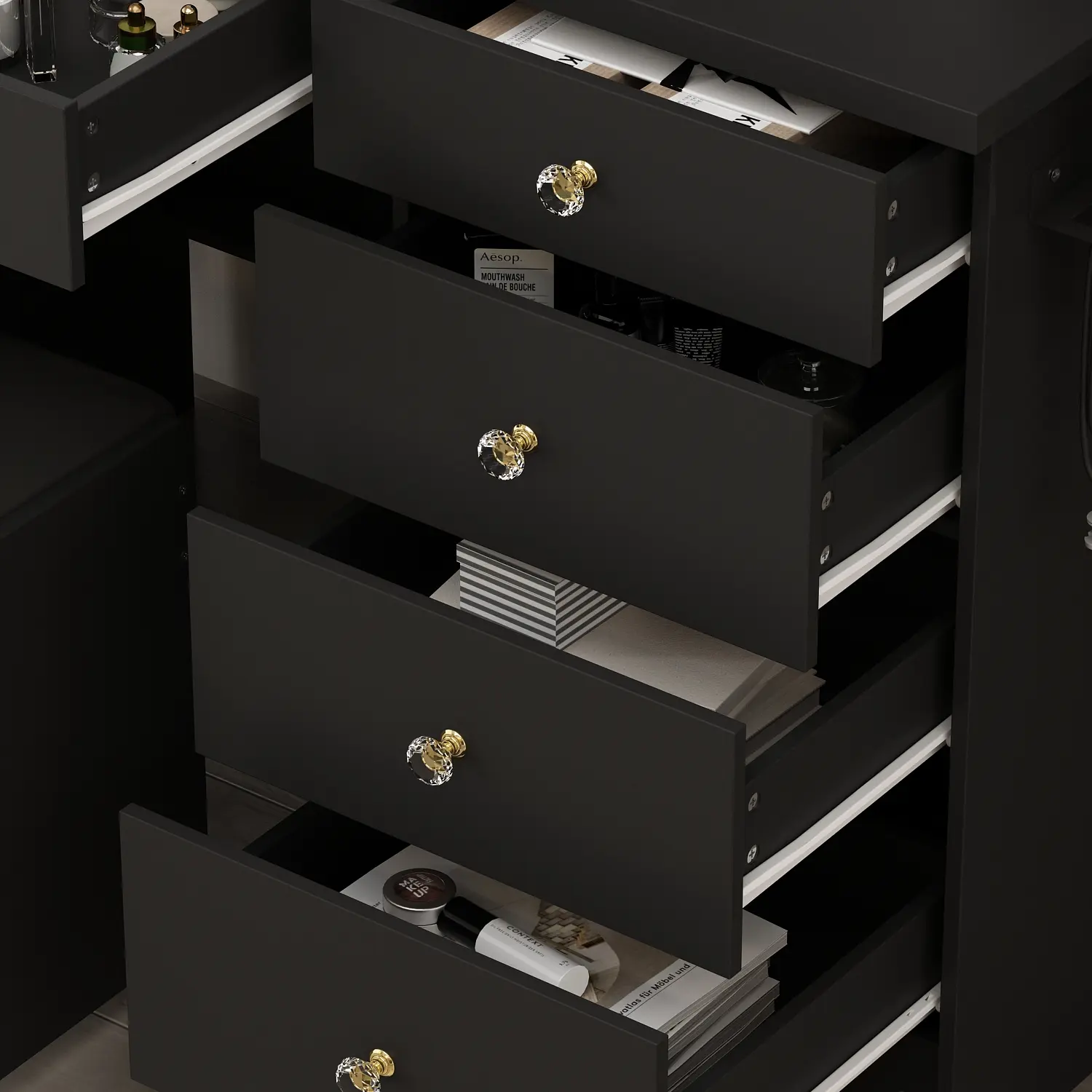 The makeup dressing table features 5 drawers, 3-tier open shelves on the desktop, 3-tier hidden shelves behind the mirror and hair dryer holder. The built-in power strip on the side is convenient for phone charging and doing hair. There is sufficient space to store your various cosmetics, jewelry, perfume, photos, decorative crafts and other essentials