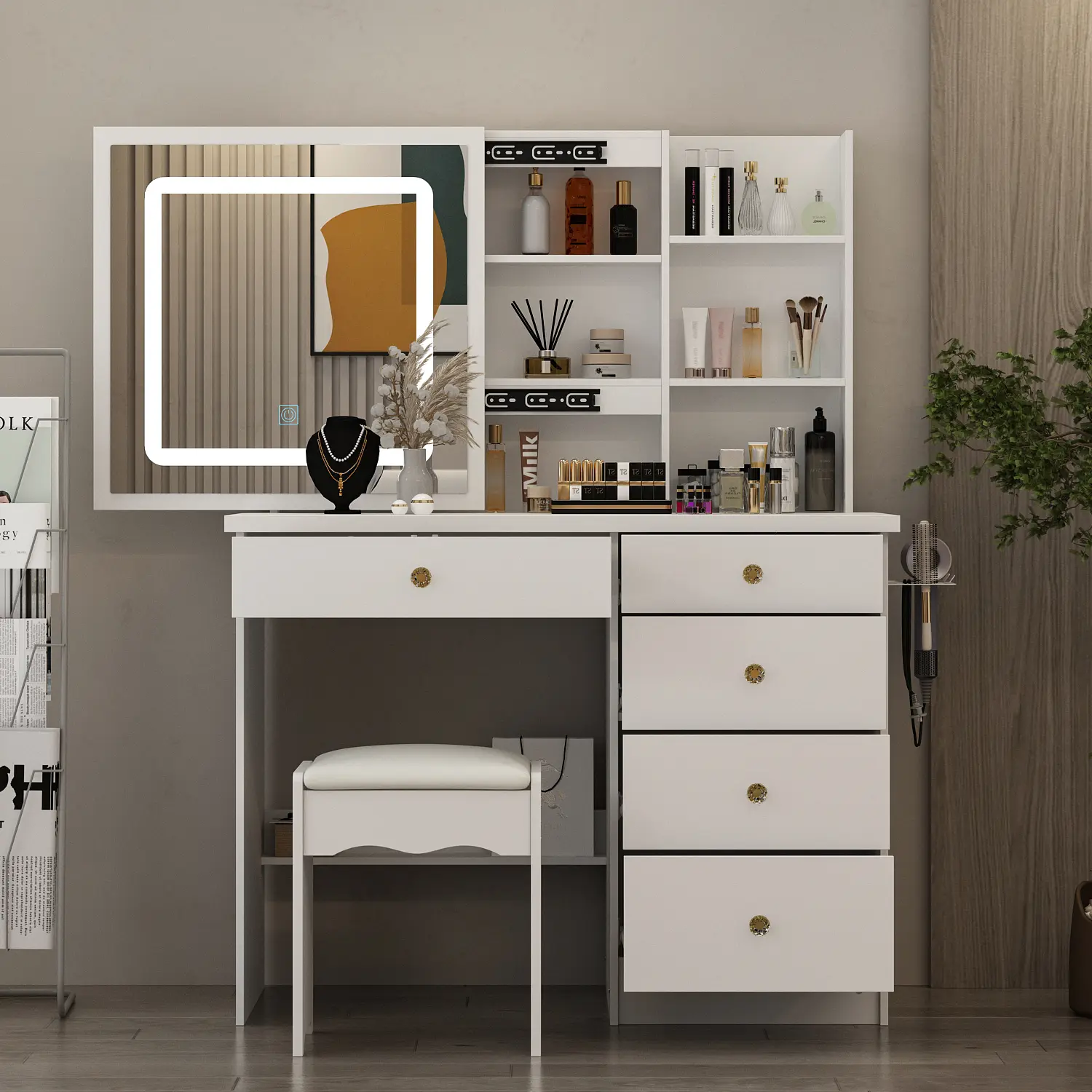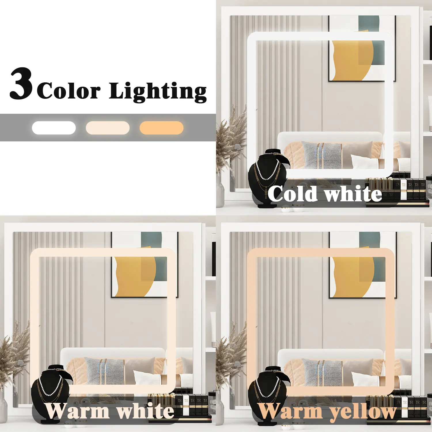 This white vanity desk set features an intelligent touch LED mirror, the brightness will change gradually when you are long pressing the button. Besides, there are 3 colors of light can be switched, the mirror can be sliding. It’s easy to do makeup with the lighted mirror