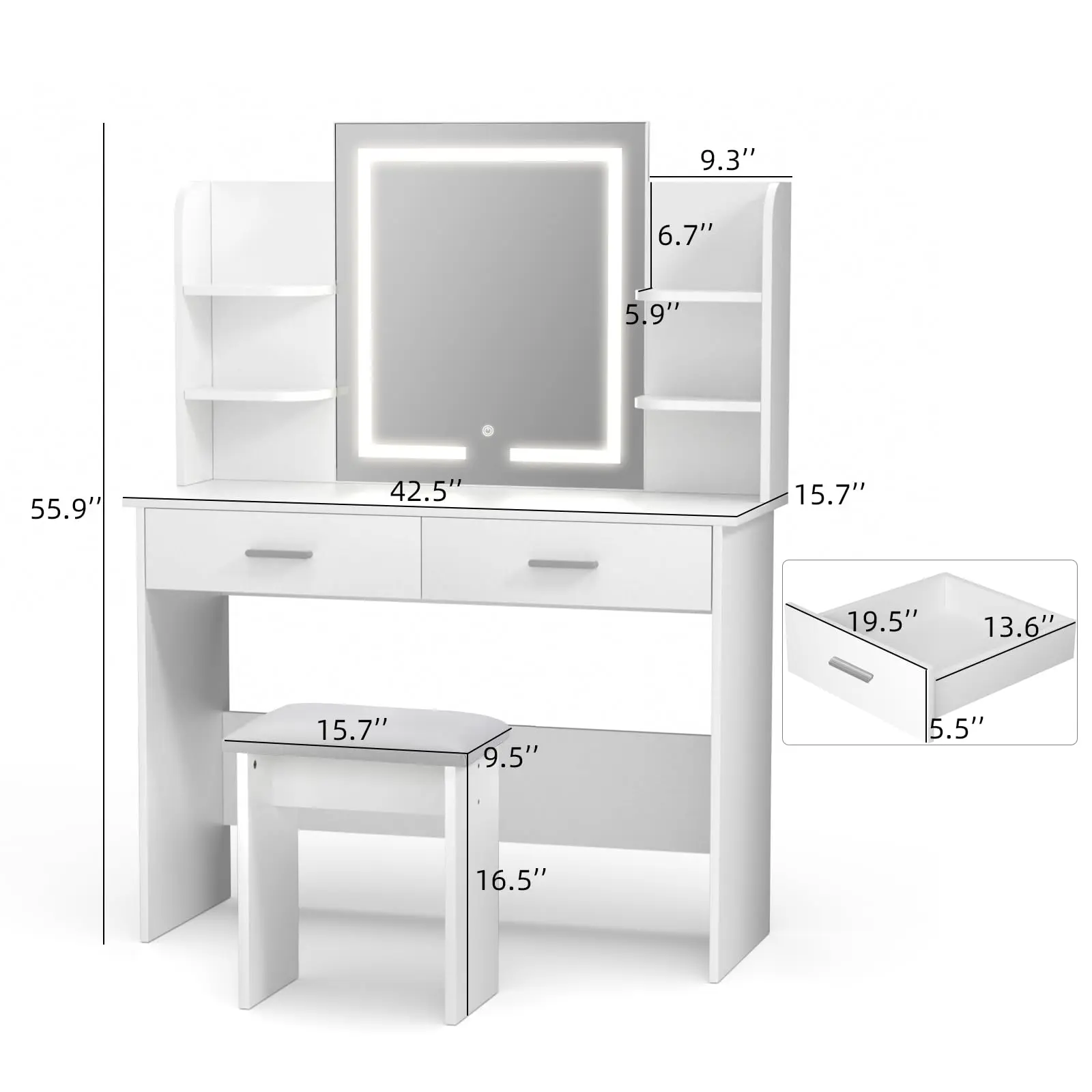 Although putting the drawers together was a hassle it came out to look exactly how it was supposed to and true to picture! Lights are very bright and also can be dimmed.