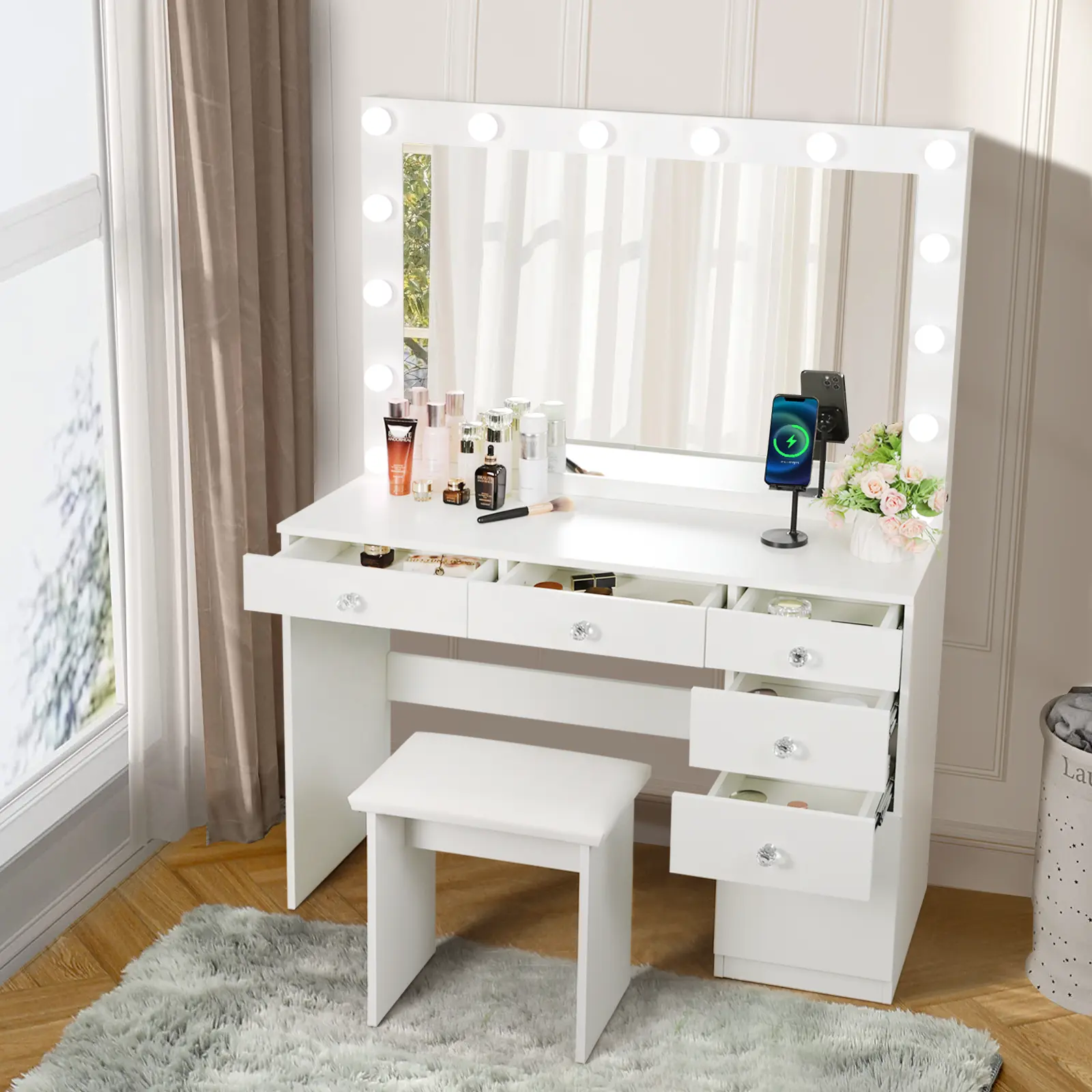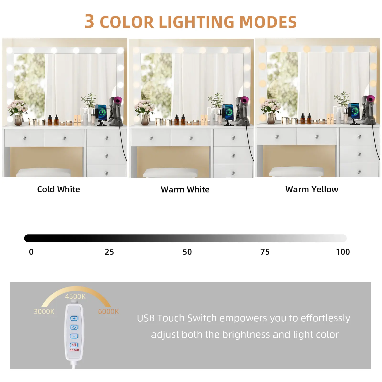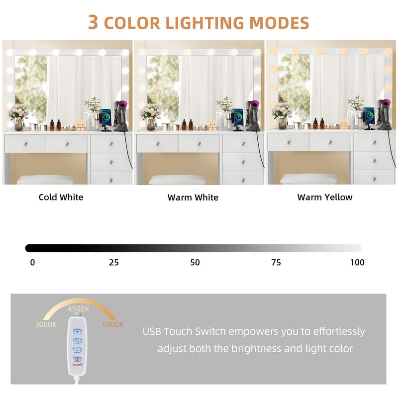 ◆PERFECT LIGHTING: This modern vanity is equipped with 14 high quality LED bulbs with no exposed wires, providing good lighting for your makeup, hair styling, photo shoots or video production. In addition, you can freely adjust the light color and brightness to meet different makeup needs: daily makeup, OL makeup or date makeup. 3 color light settings: warm yellow, warm white and cool white.