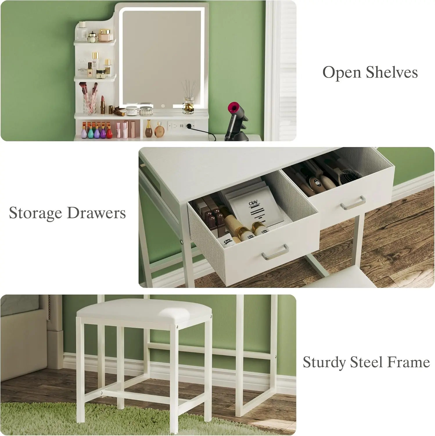 ·Durable & Sturdy Build: Crafted from premium MDF board, non-woven fabric, and supported by a strong metal frame, this vanity desk ensures long-lasting stability and durability.