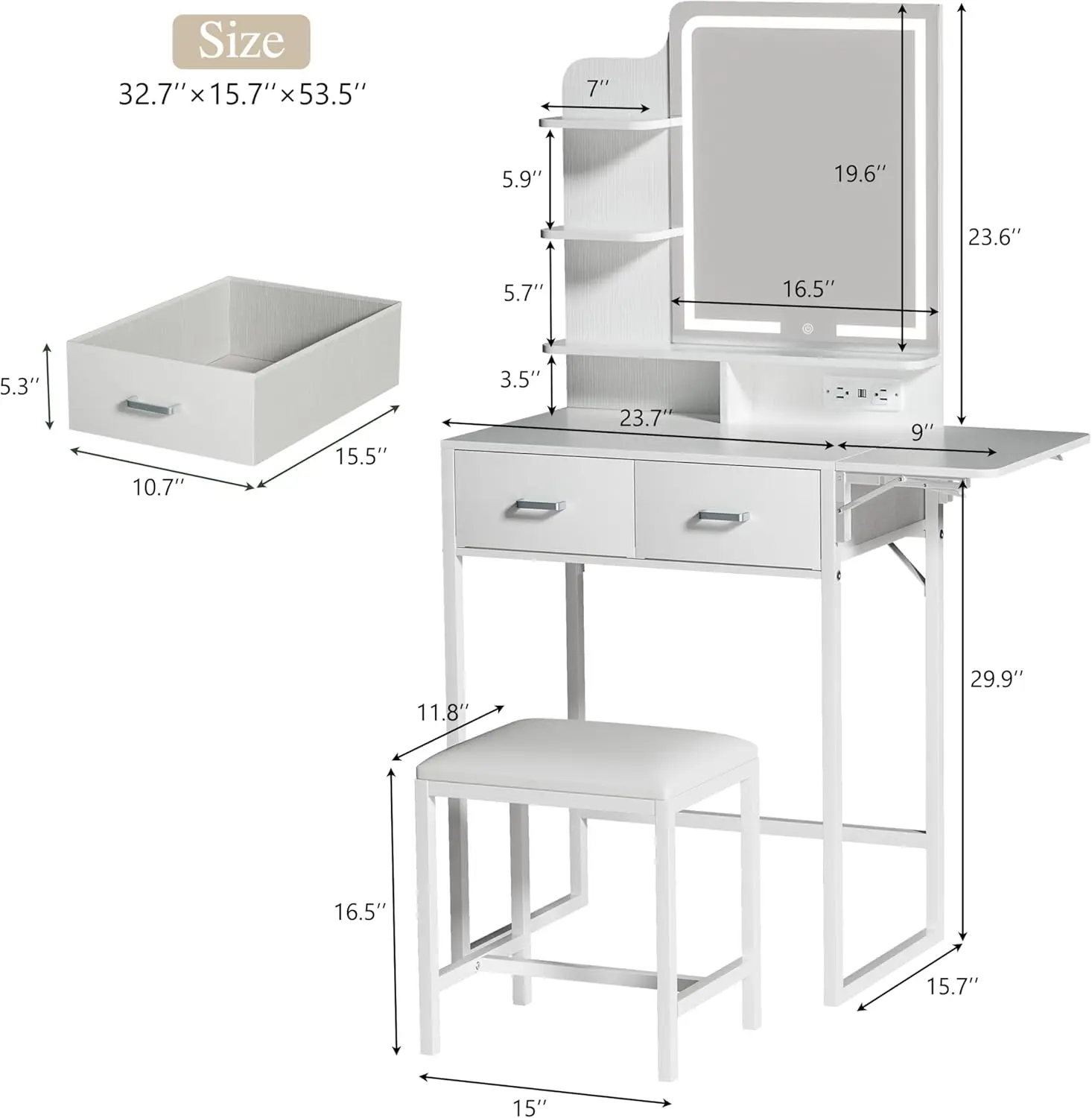 ·Ample Storage in a Compact Design: Organize effortlessly with 3-tier side shelves, 2 compartments, a fold-up panel, and 2 fabric storage drawers, providing plenty of room for your essentials while keeping your vanity area tidy.