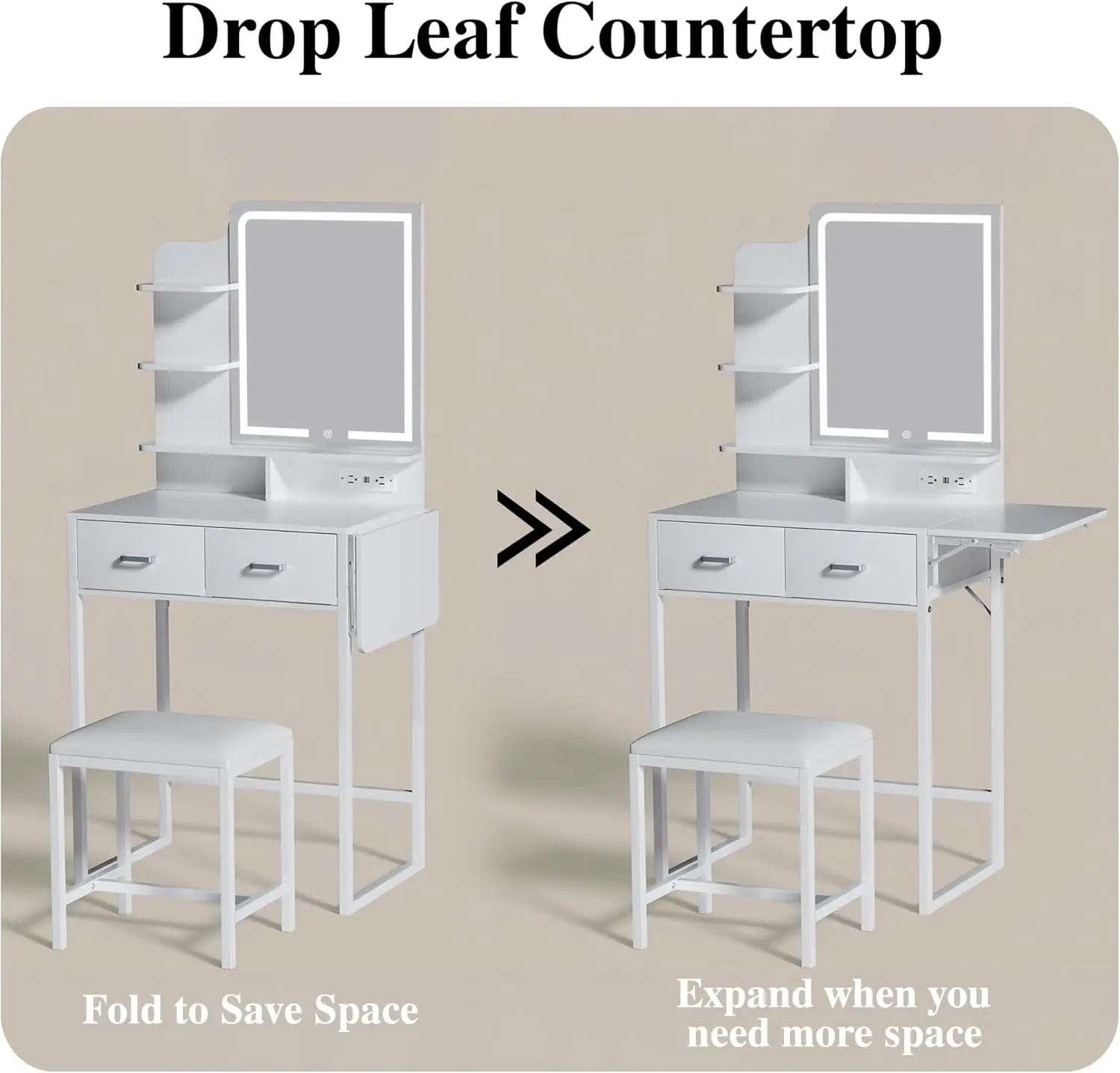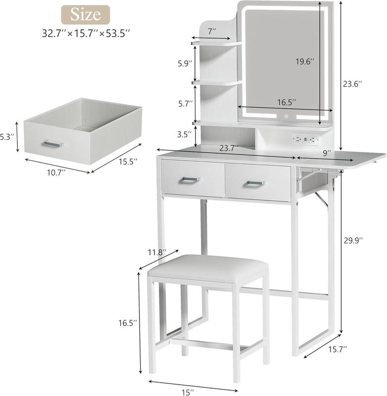 ·Expandable Design: This makeup vanity desk includes a foldable side panel that can be installed on either side, offering flexible extra space. Ideal for small spaces, it maximizes your setup for a seamless beauty routine.