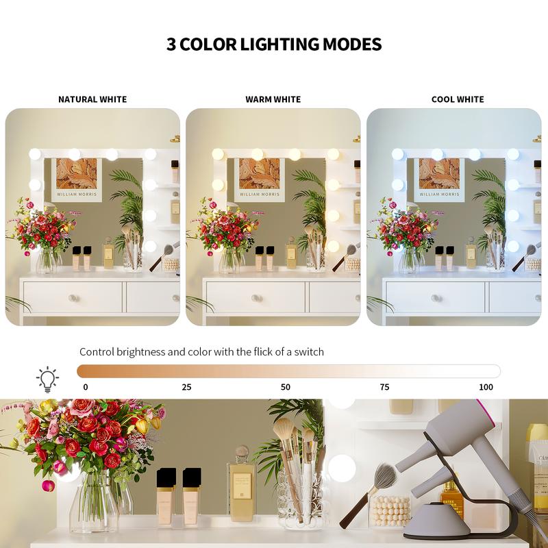 【3 Lighting & Brightness Adjustable】Equipped with a large lighted mirror with 3 color selections (warm, natural, cold white), this makeup vanity with lights creates a comfortable makeup environment to meet your different makeup needs well.