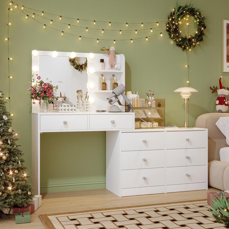 【Customized Installation】This vanity with mirror and lights features 6 drawers that can be positioned on the left or right, L-shaped or I-shaped, adjustable width to fit various spaces. It can also be used as a nightstand or workspace, offering versatile functionality and maximizing your space.