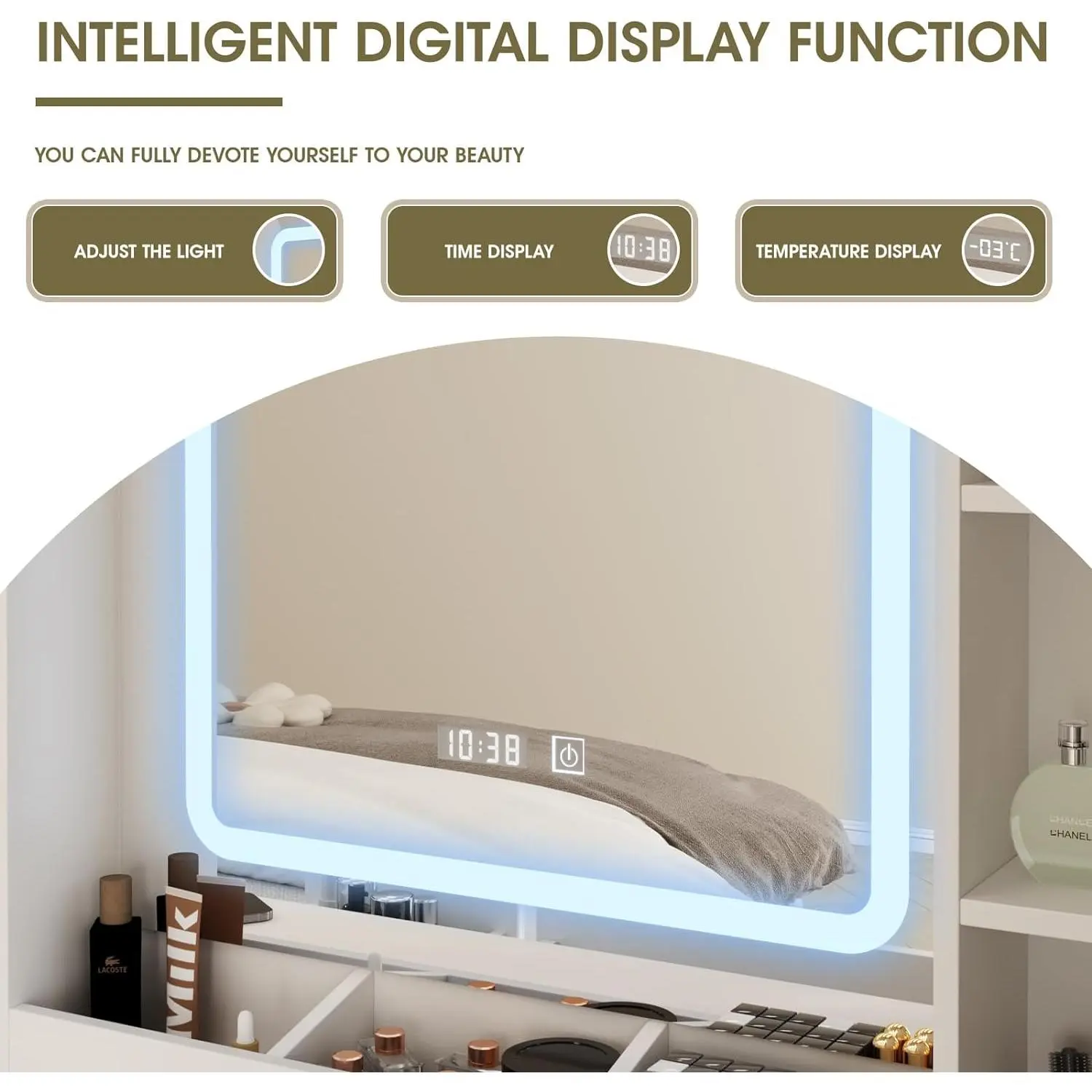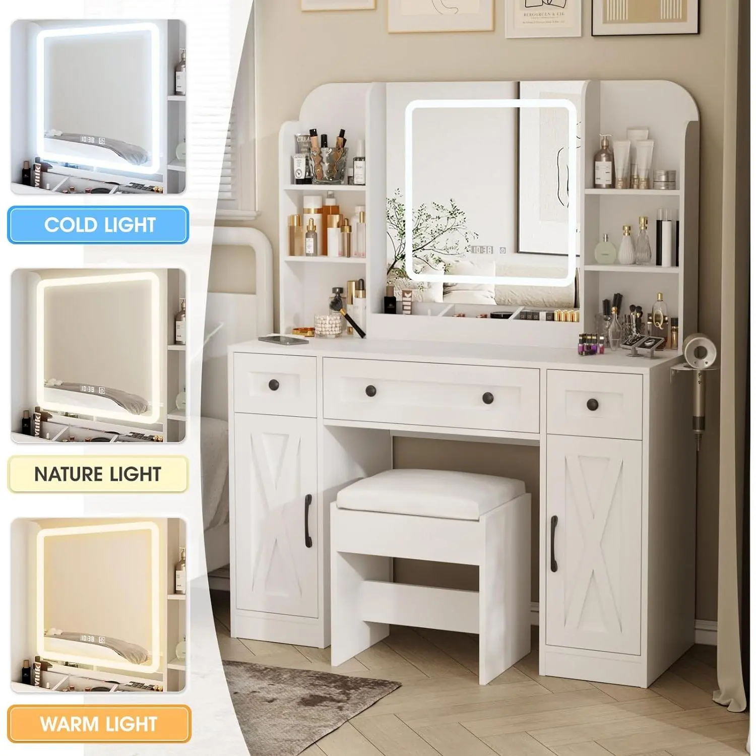 ·CUSTOMIZABLE LIGHTING: The makeup vanity desk with 3 types of lights (cool, natural, and warm light) and multiple brightness are both adjusted by the touch screen. Whether it's a daytime look or an evening glam, you can now have the ideal lighting at your fingertips.