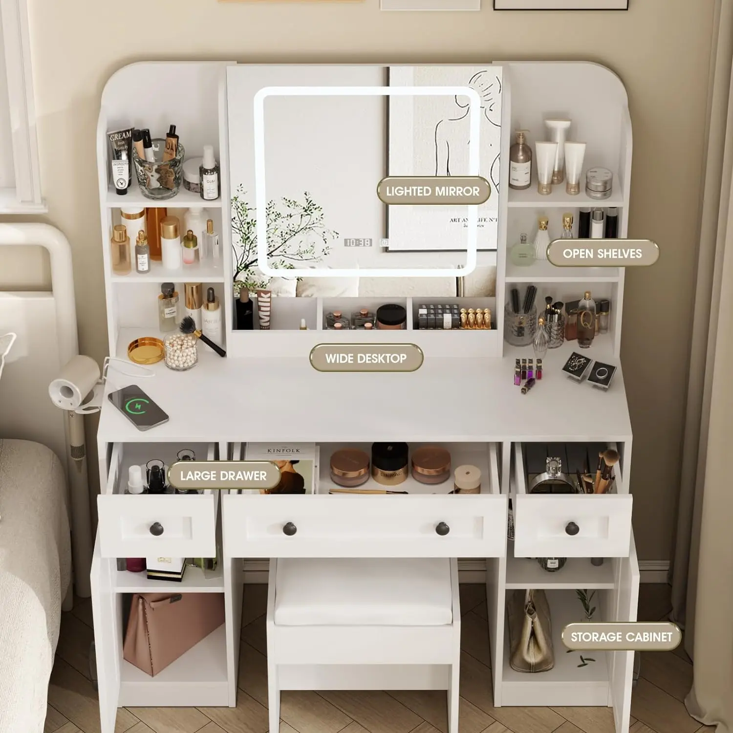 ·CONVENIENT CHARGING DESIGN: The make up vanity with 5 built-in charging stations (3 outlets and 2 USB ports) will solve your problem of not having a port to plug in your hair dryer, and you can charge your phone while applying makeup at the same time. The desk also has a special hook to put the hair dryer conveniently.