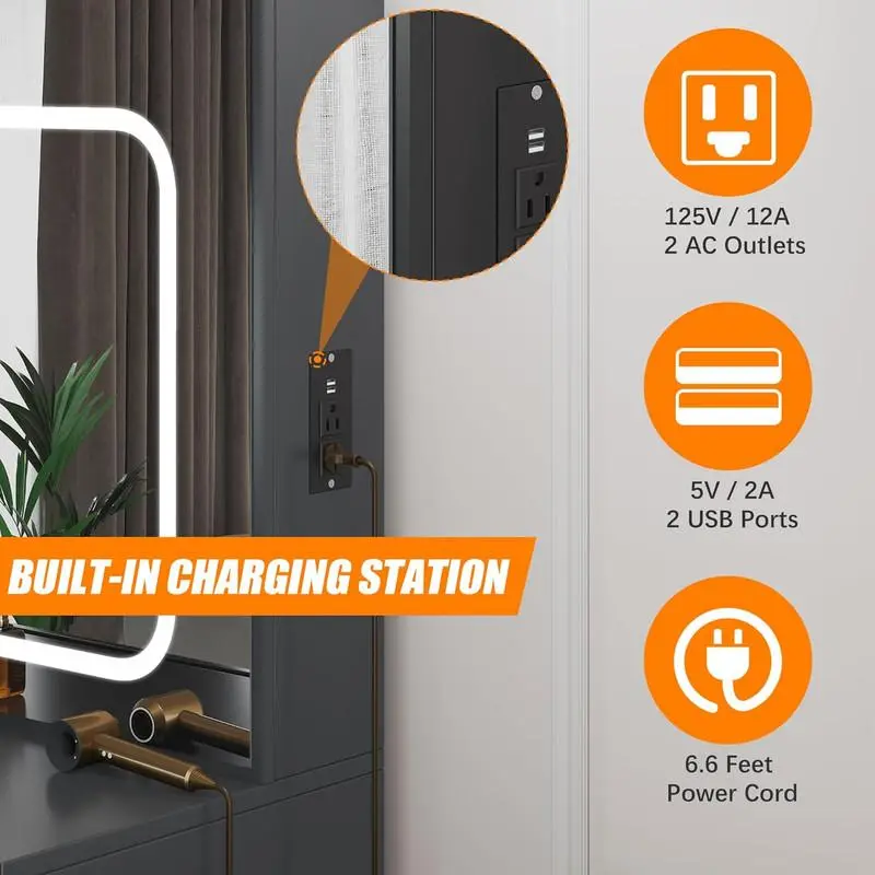 [Vanity Desk with Charging Station] - A multi-functional dressing table that combines 2 standard plug sockets, 2 USB ports, so your mobile phone, and curling iron can be within arm's reach; Glam make up vanity for dressing room, bedroom, salon, or live broadcast.