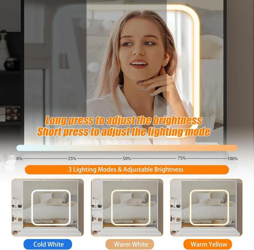 [Touch Control Sliding Lighted Mirror] - The LED lights of the makeup table have 3 different color modes: warm yellow, warm white and cool white. Touch the switch to change the color, and long press the switch to adjust the light brightness. You can adjust the light brightness and color according to your preferences, which can provide a perfect atmosphere for your daily skin care/makeup/styling and help you create a perfect and exquisite makeup.