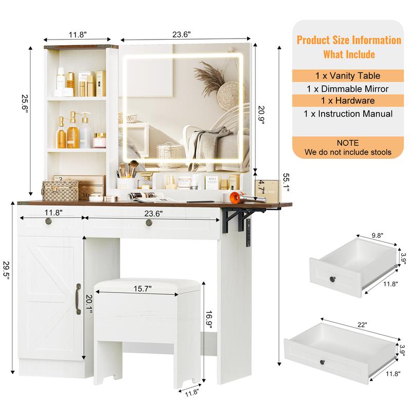 ·Foldable Extension Desk: The right side of the tabletop includes a foldable extension board, providing additional workspace for all your beauty needs.