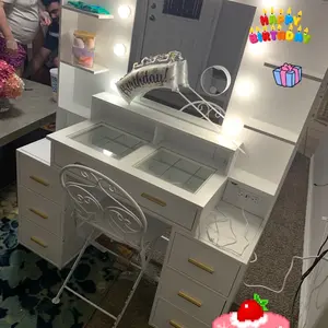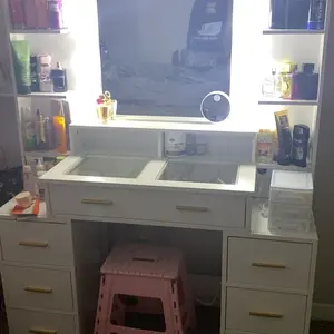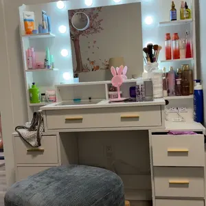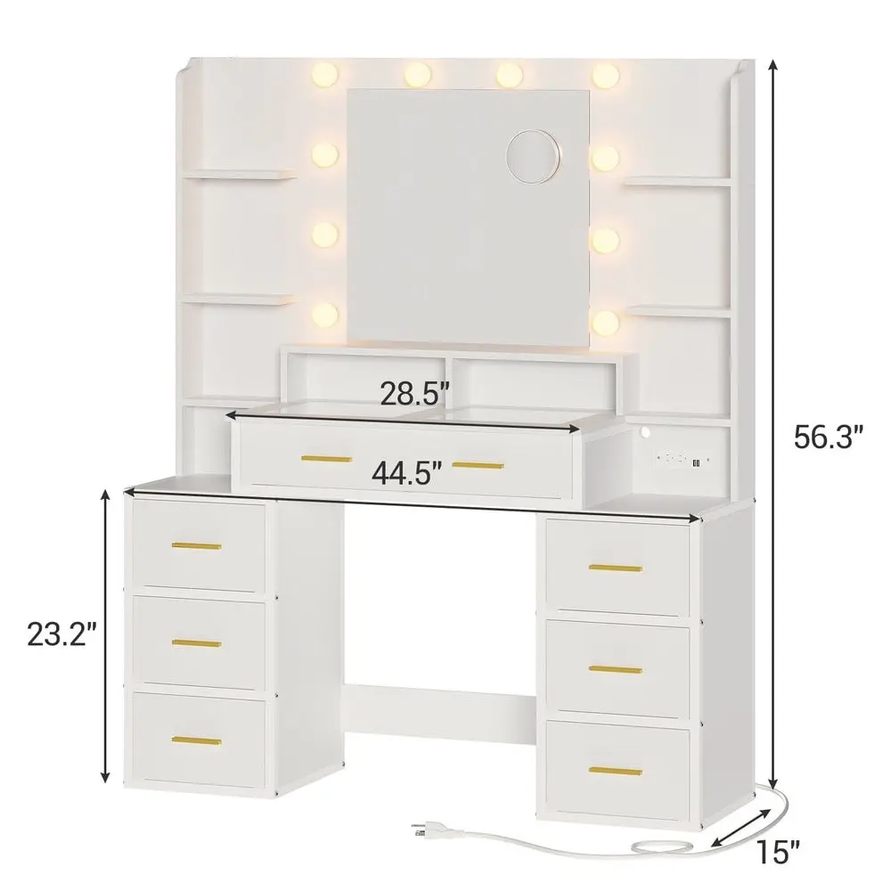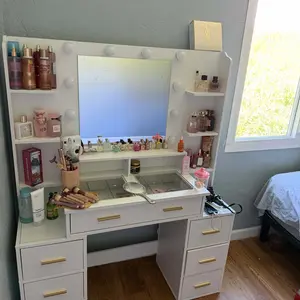 This modern makeup vanity features a large mirror surrounded by 10 hollywood-style light bulbs. 3 light settings: warm yellow, warm white and cool white. Press the switch to adjustable brightness.