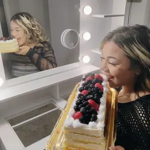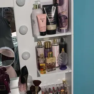 This vanity is equipped with a removable 10x magnifying mirror. It has suction cups so you can stick it on the plane mirror or hold it for more precise beauty care.