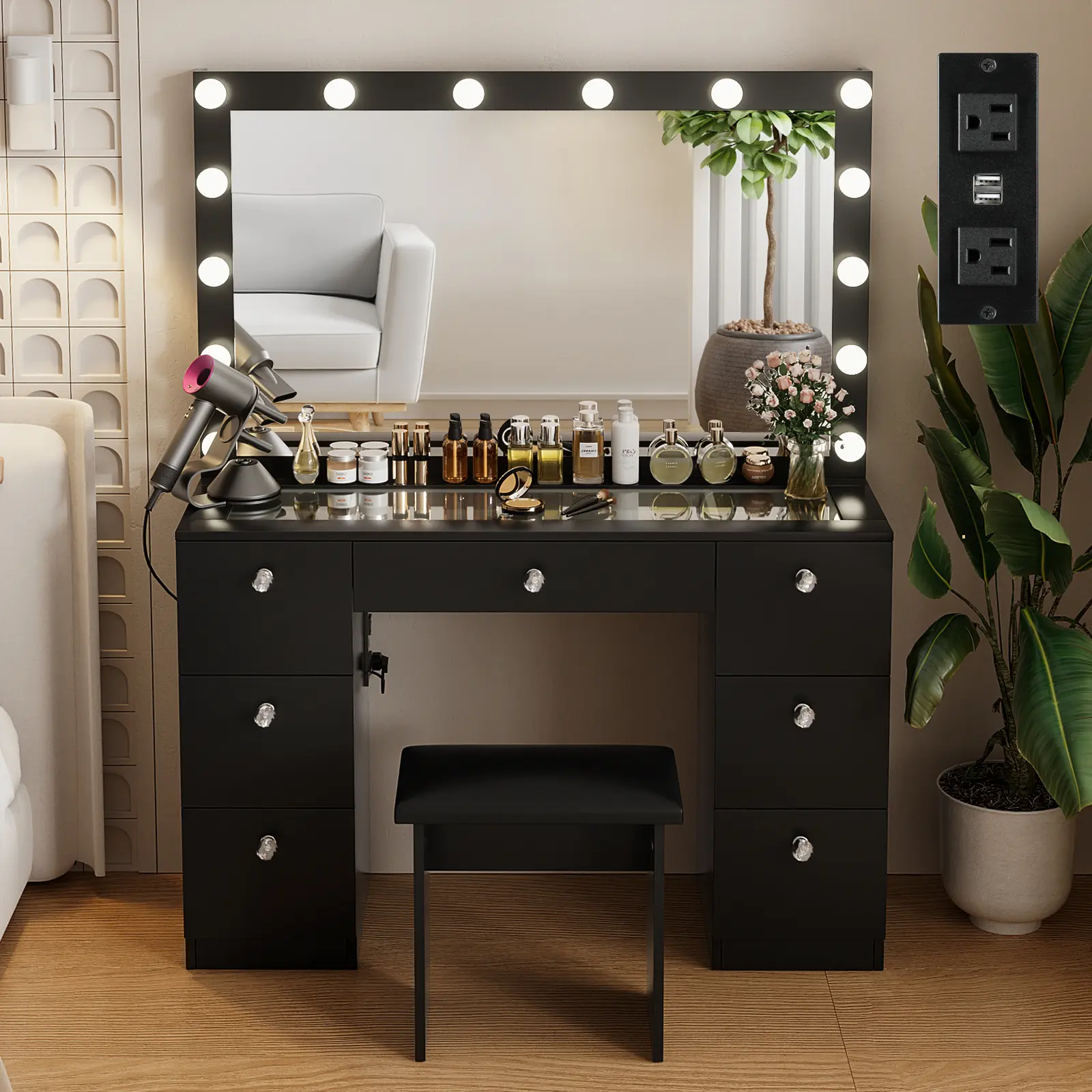 ◆Convenient Charging Station: Equipped with 2 standard plug sockets and 2 USB ports, this makeup desk allows for easy charging of hair dryers, curling irons, beauty devices, and phones.