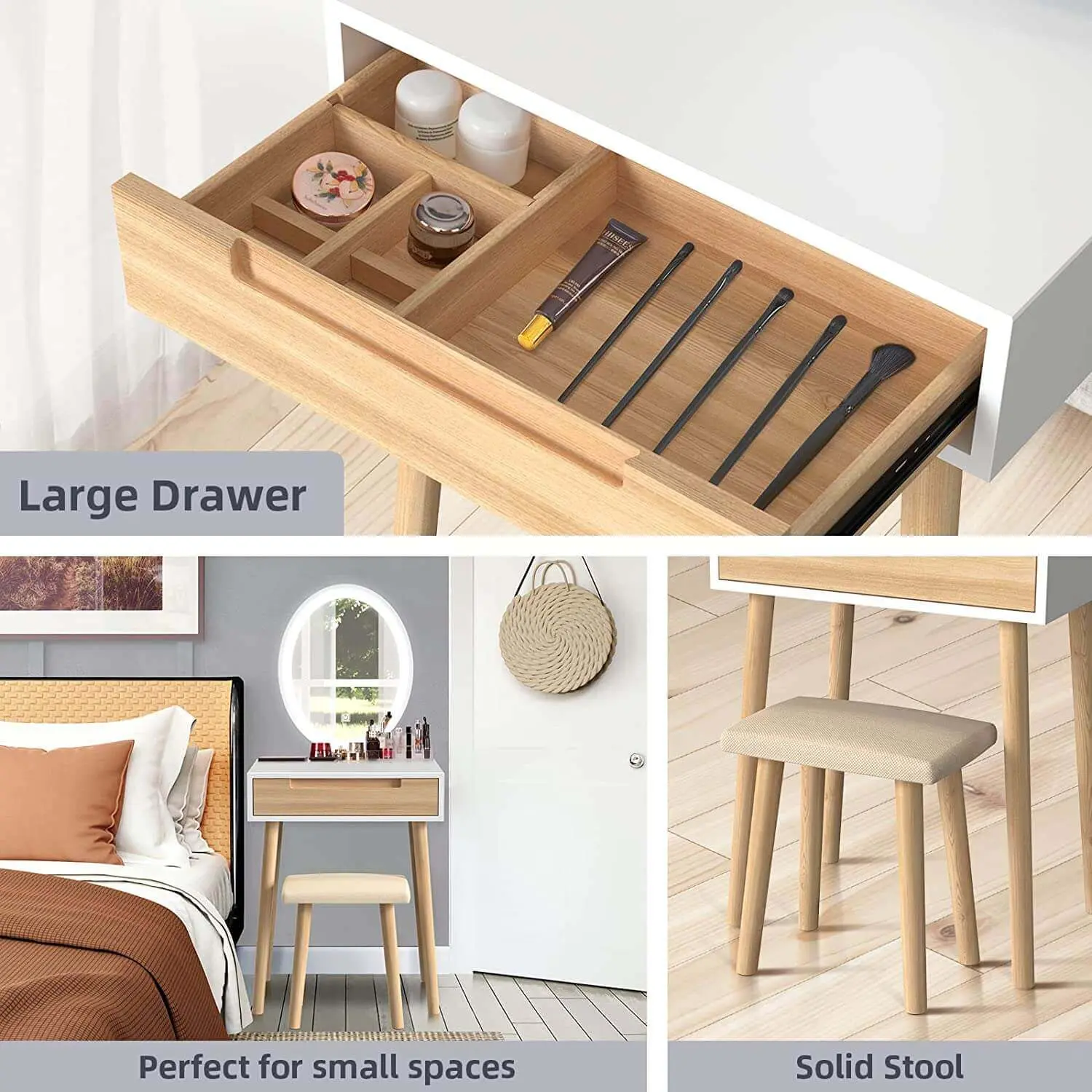 ·SOLID & STURDY WOODEN FRAME: Featuring durable and well-made high-quality materials, this vanity table will be the practical household furniture for a long time. Premium hardware and sturdy frame structure with wood legs give sufficient stability and great load-bearing capacity. In addition, the anti-slip mats and anti-toppling fitting are designed to ensure extra safety.
