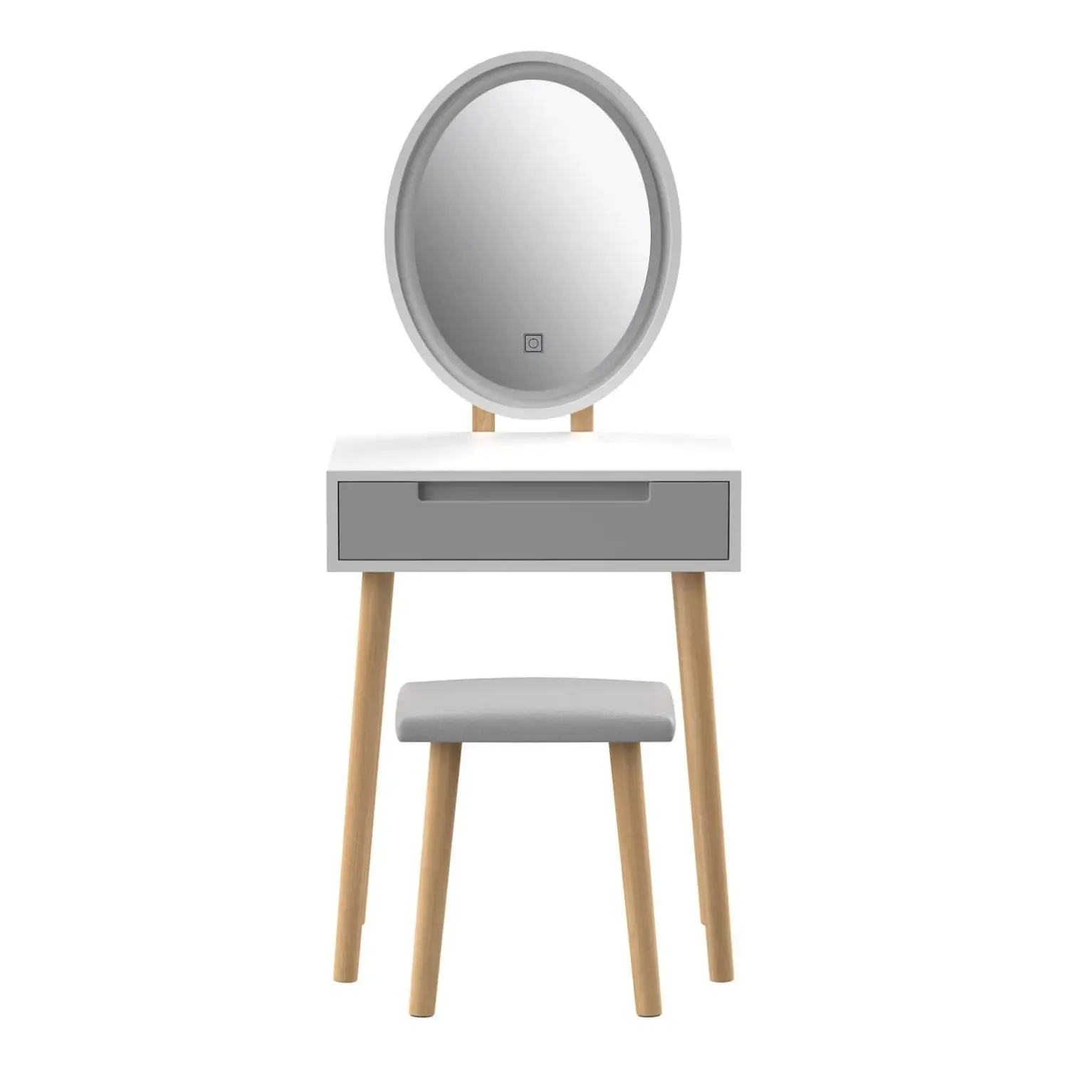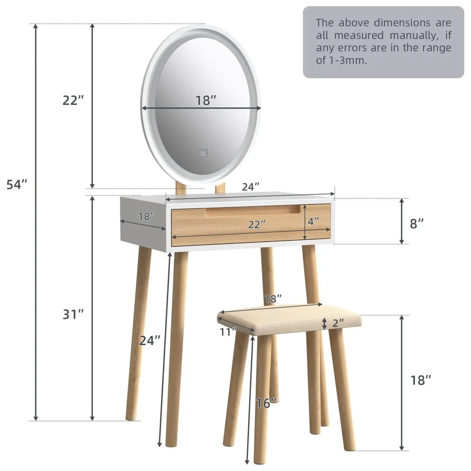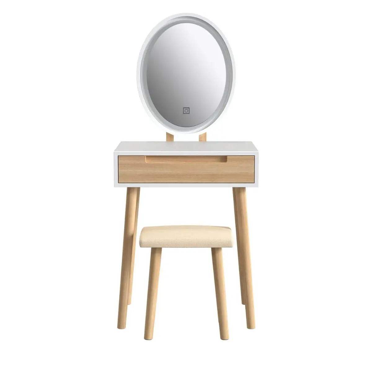 Starting your morning routine with this unique style vanity set. Featuring a large LED lighted mirror. Built-in 3 color temperature LED light with dimming function and intelligent touch button, no complicated operation, one button to switch 3 lights. 1 drawer and a spacious desktop provide large storage space to keep everything needed within your reach.