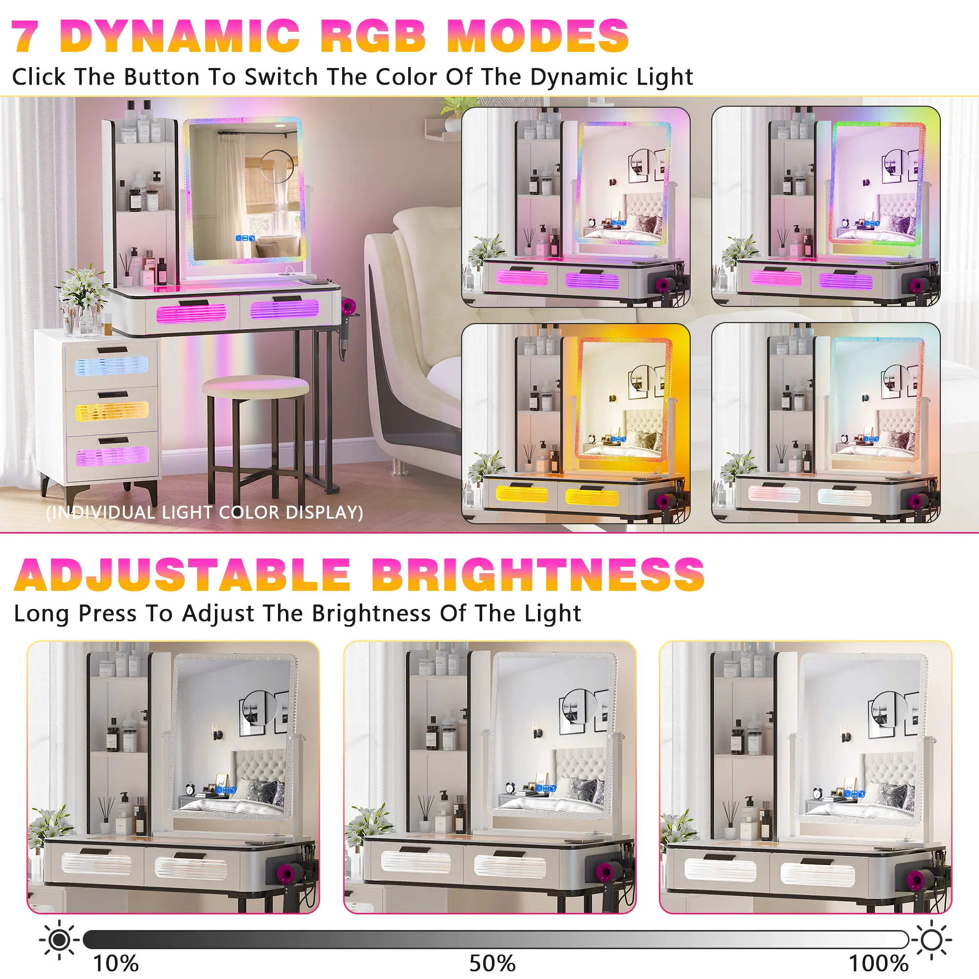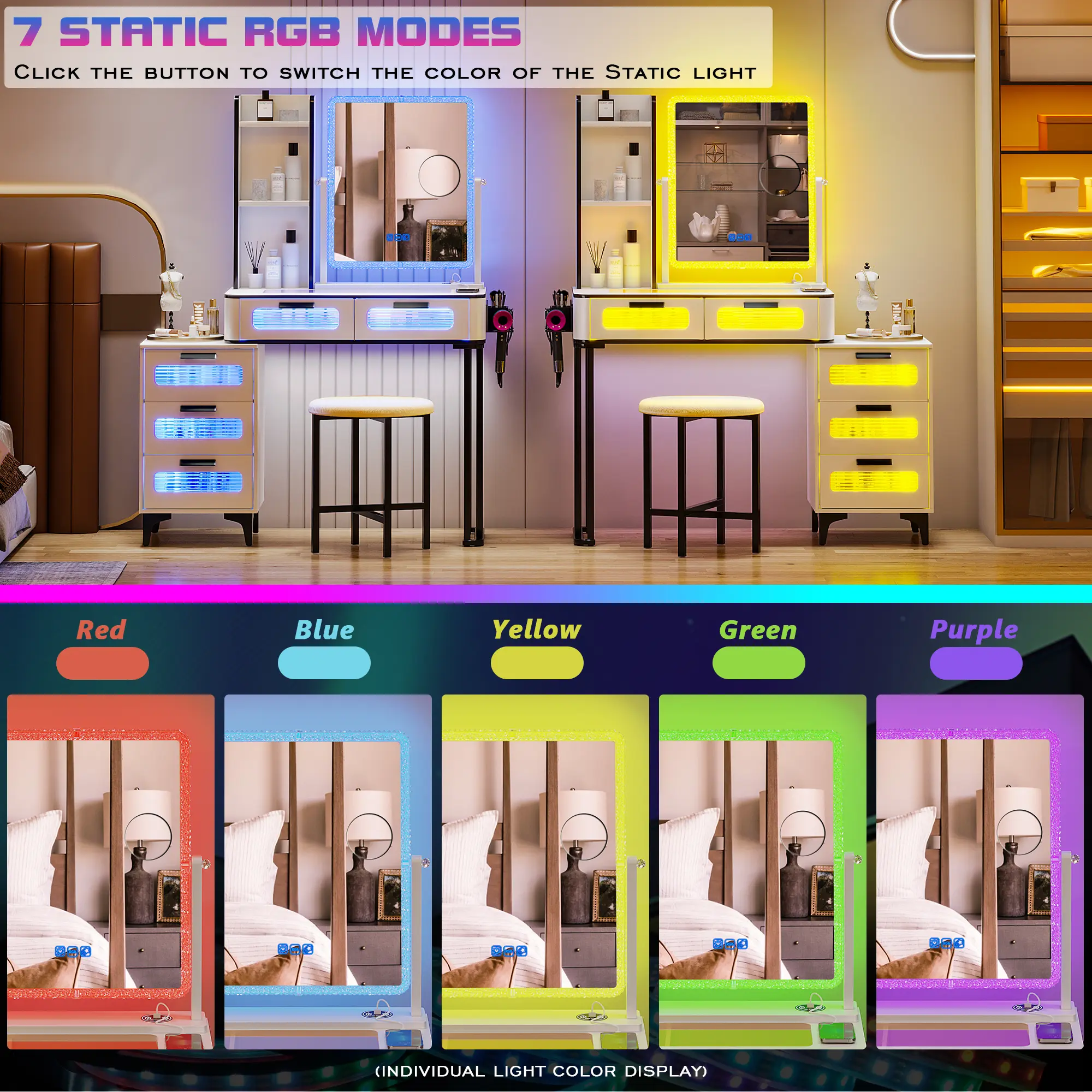 ✨ This mirror offers 7 dynamic and 7 static RGB modes. Change the lighting to suit your mood. The charming ambiance enhances makeup application and doubles as a background for photos and videos. Perfect for creating a versatile lighting experience.