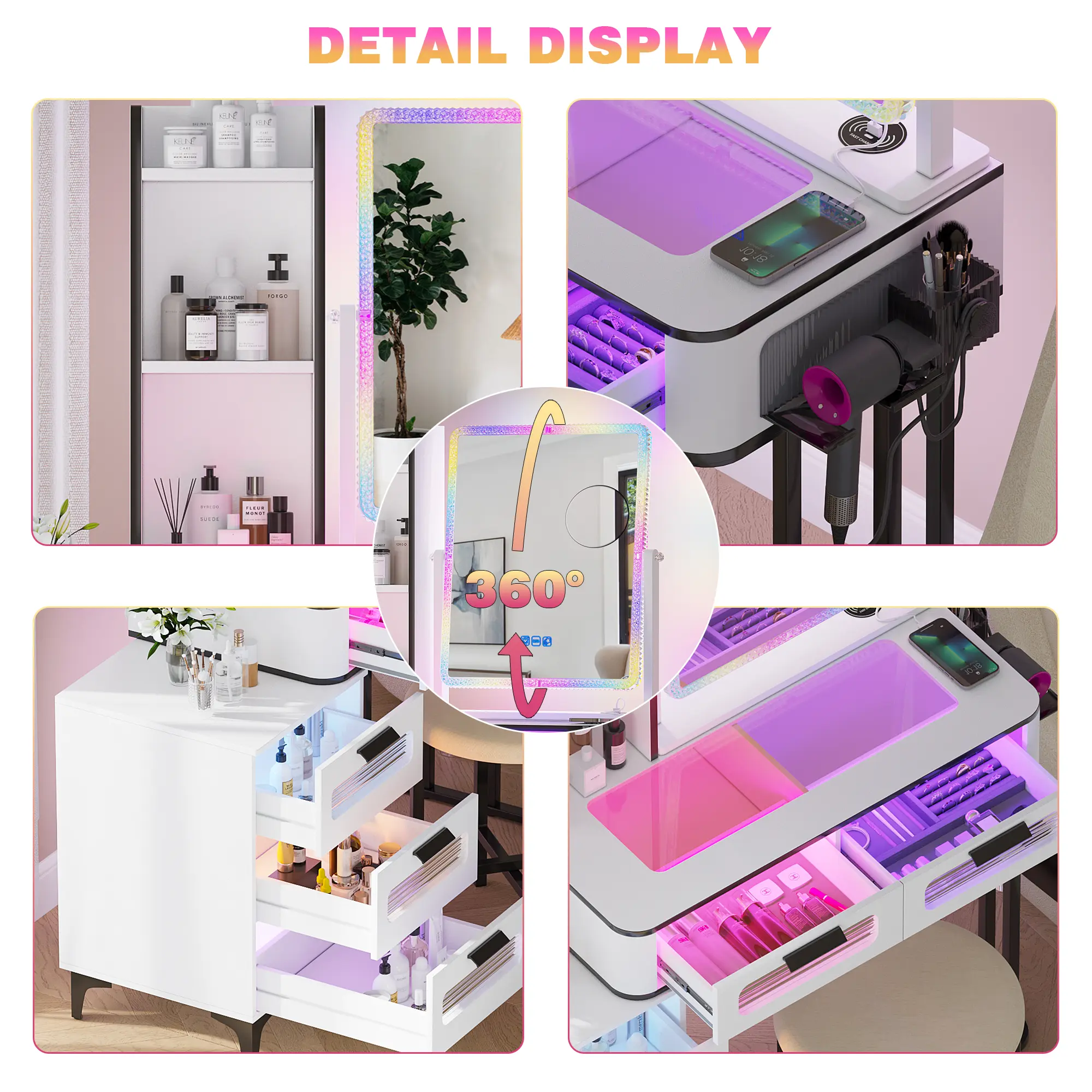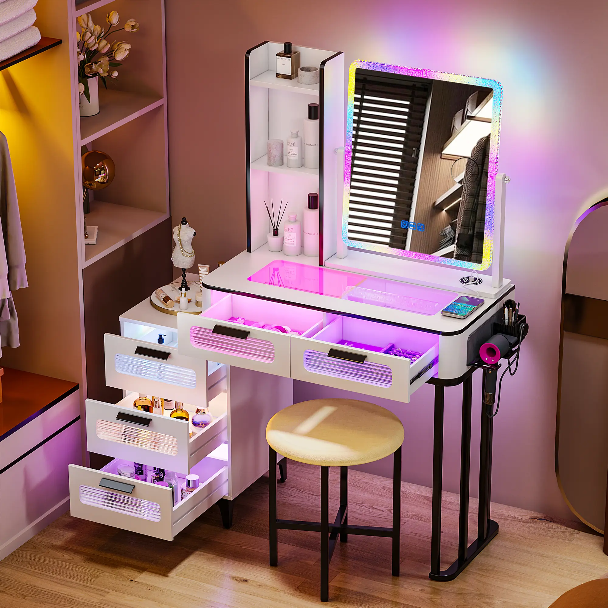 🔌 Equipped with 1 USB and 1 TYPE-C port, plus a wireless charging station. Charge your devices while you apply makeup. Stay connected and productive during your beauty routine.