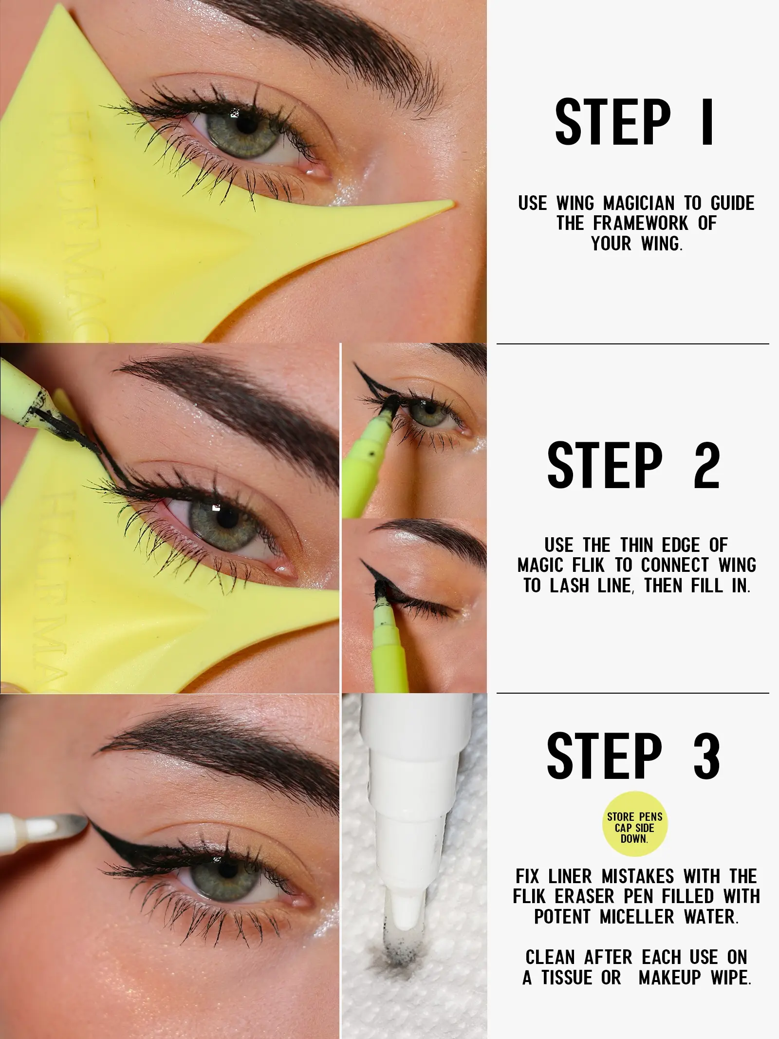 The eyeliner pen is so dry it doesn't work. The eraser pen works great for other eyeliner pens. The guide is fine.