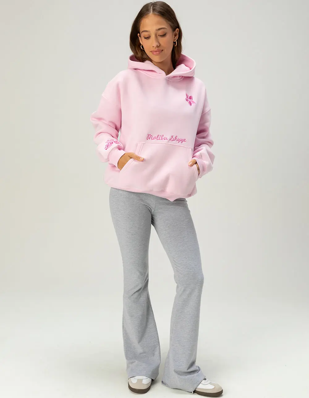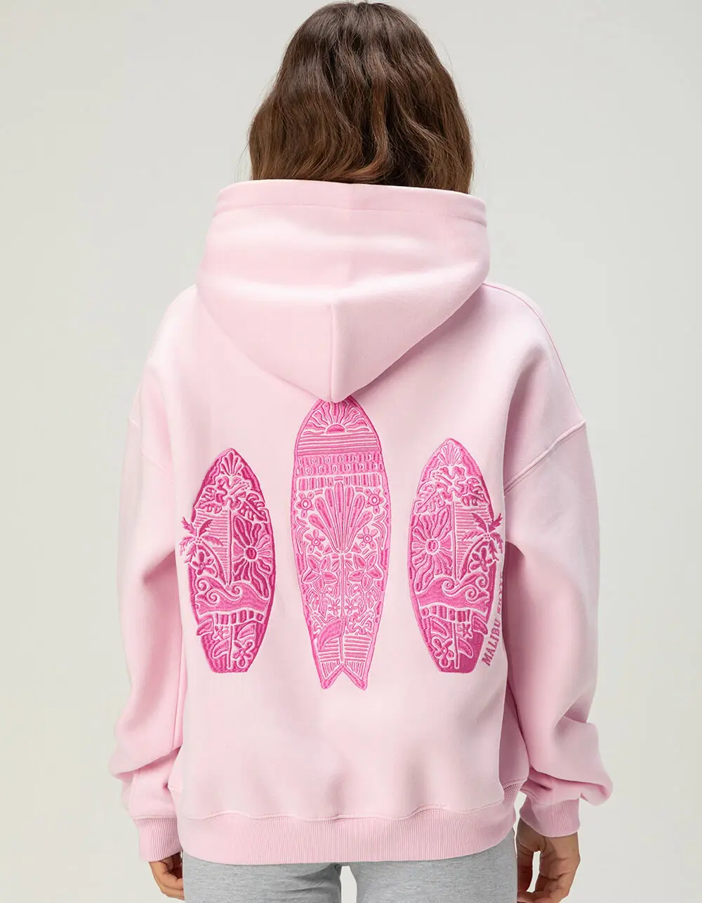 Malibu Skyye Sunny Hoodie. The Malibu Skyye Sunny Hoodie brings a playful, feminine vibe to cozy layering. Designed in a soft pink fabric with a plush fleece lining, this hoodie features an embroidered floral detail at the left chest and “Malibu Skyye” embroidery just above the front pouch pocket for subtle, charming branding. A fixed hood and cuffed long sleeves with an embroidered accent at the right cuff add thoughtful finishing touches, while the back showcases three surfboards with floral embroidery for a bold, summery statement. Perfect for pairing with jeans, shorts, or lounge bottoms, this hoodie combines comfort, warmth, and signature Malibu Skyye style. 50% Cotton 49.8% Polyester 0.2% Viscose. Machine wash. Imported.