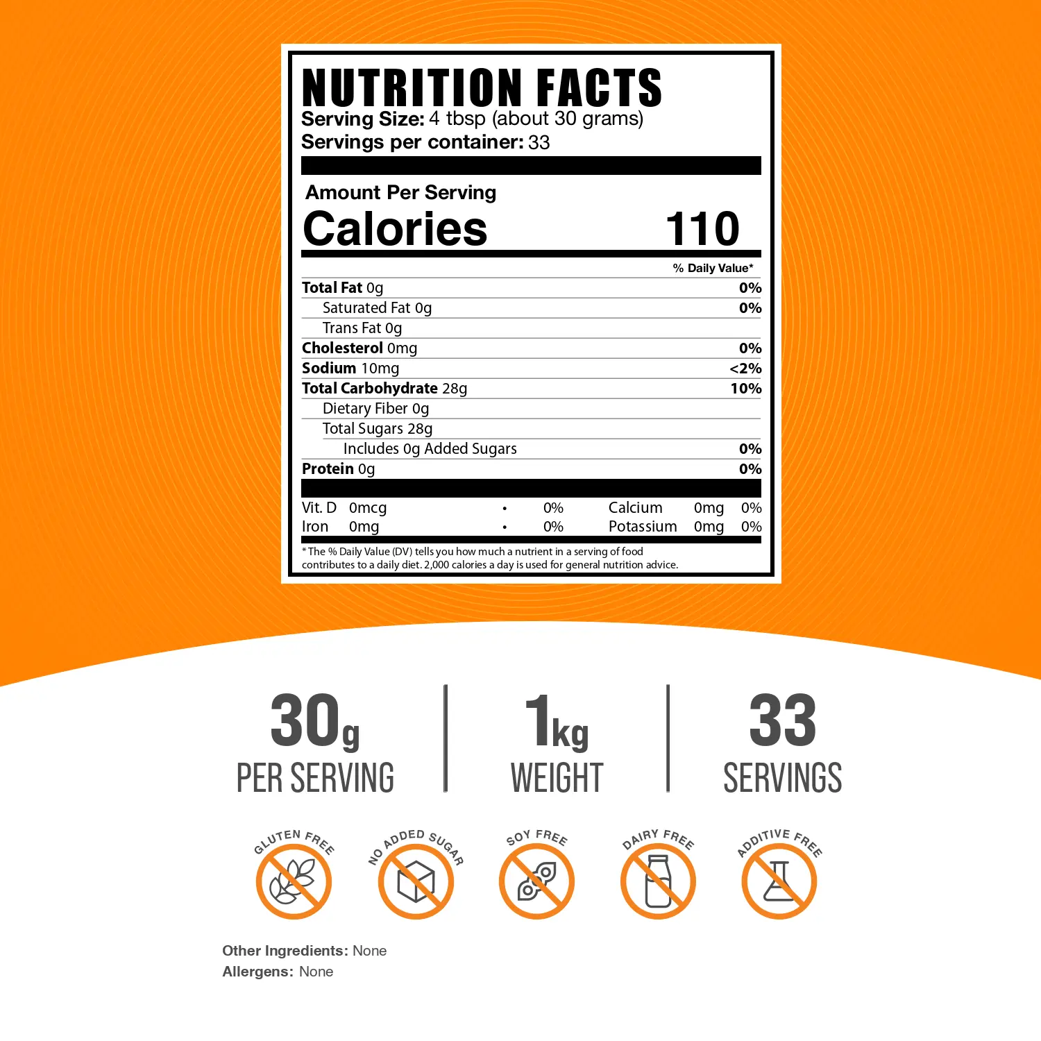 Free of: Gluten, Added Sugar, Soy, Dairy, Additives