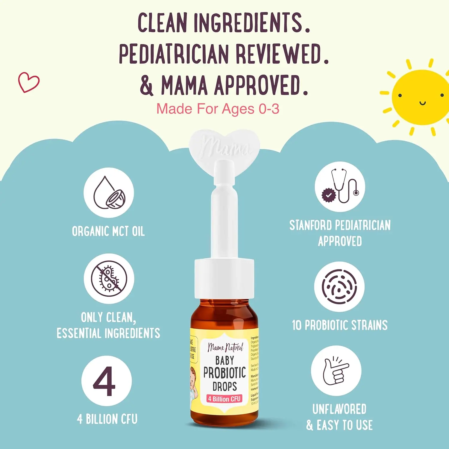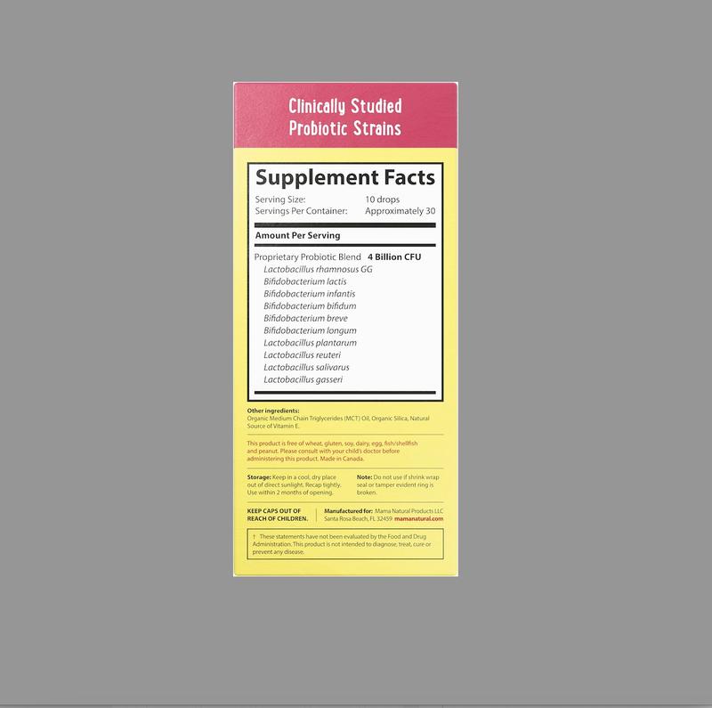Each serving of Mama Natural Baby Probiotic Drops contains 4 billion CFU from 10 research-backed probiotic strains. These include L. rhamnosus GG, B. infantis, L. reuteri, and B. lactis, known for supporting digestion, regularity, and developing immune health. Formulated by holistic pediatricians for gentle, effective gut support from the start. Perfect for ages 0–3, these drops bring peace to your day.