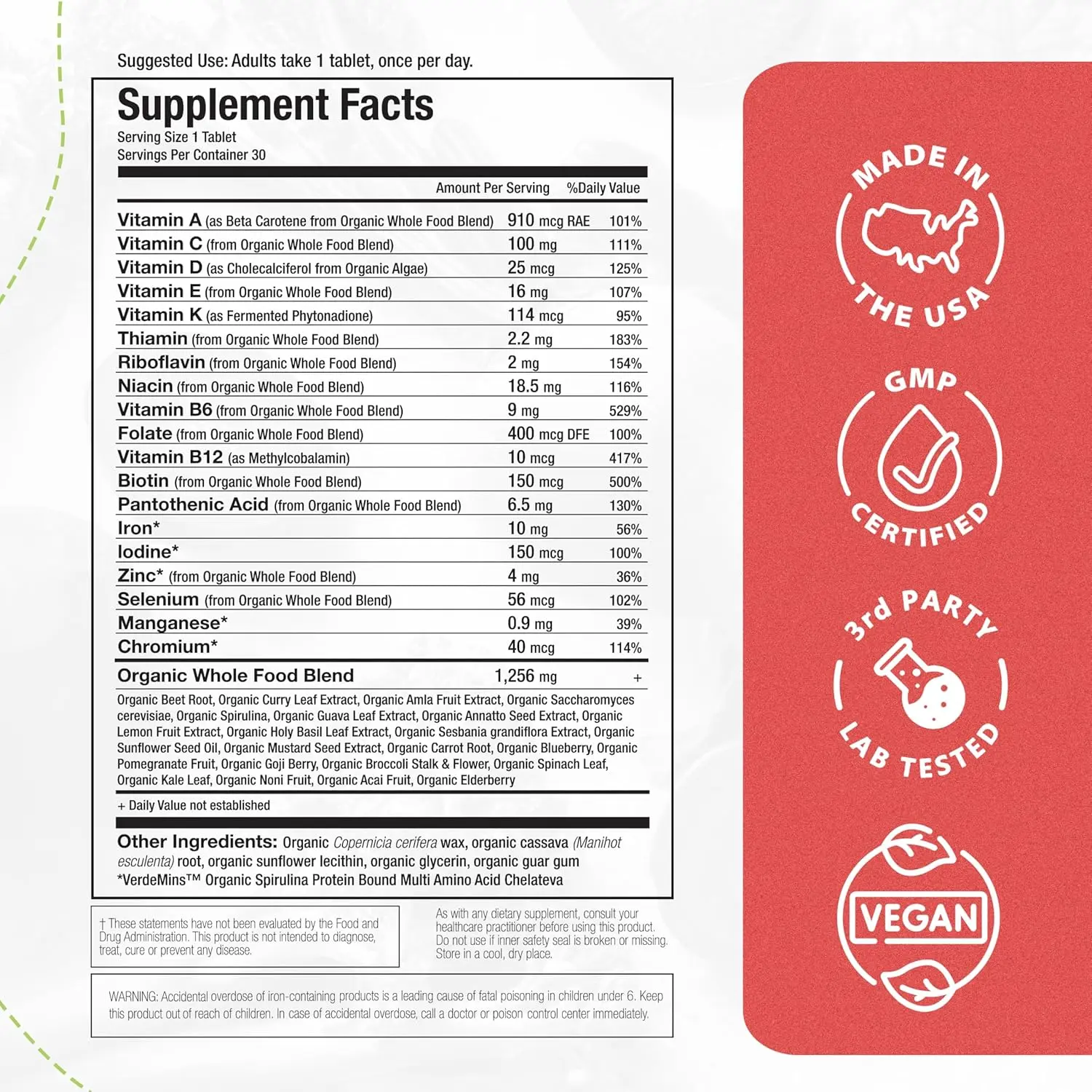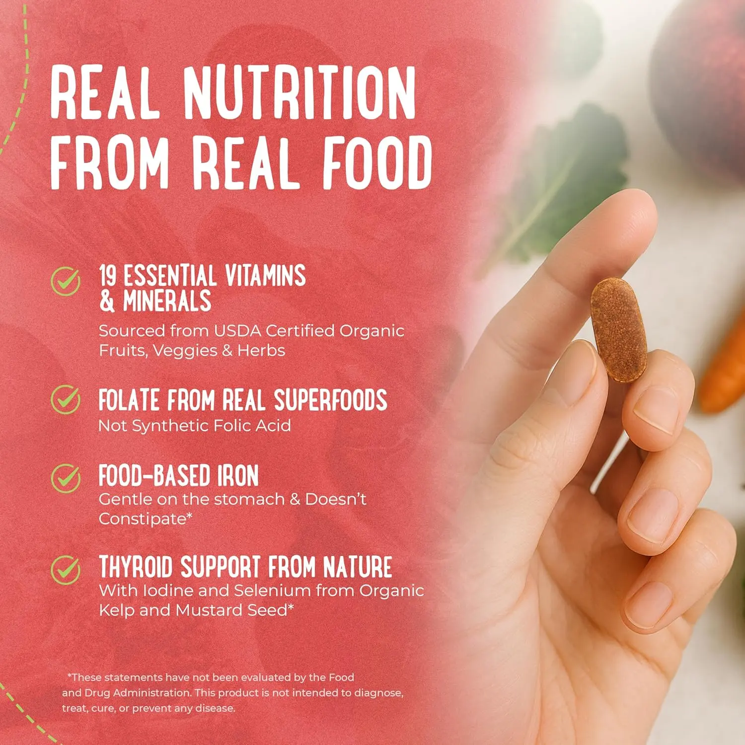 ·Farm to Tablet Formulation – Made with whole food Ingredients, this daily multivitamin for women delivers 19 essential nutrients sourced from USDA Certified Organic fruits, vegetables, and herbs. Your body recognizes these ingredients because they come from real food, not a lab.*