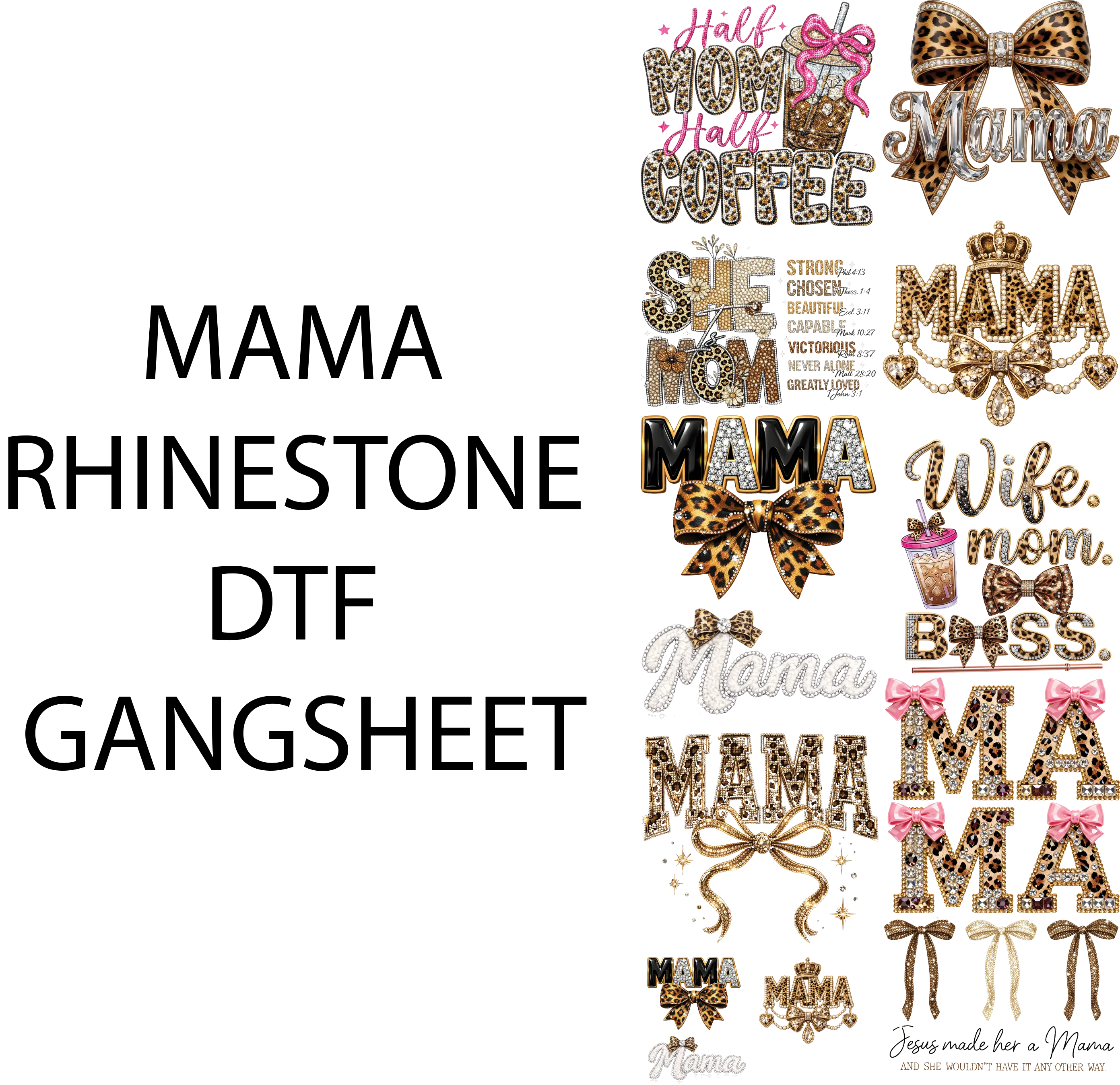 MAMA RHINESTONE DTF GANGSHEET FOR SHIRMAKING with Leopard Bow Design and Coffee Theme