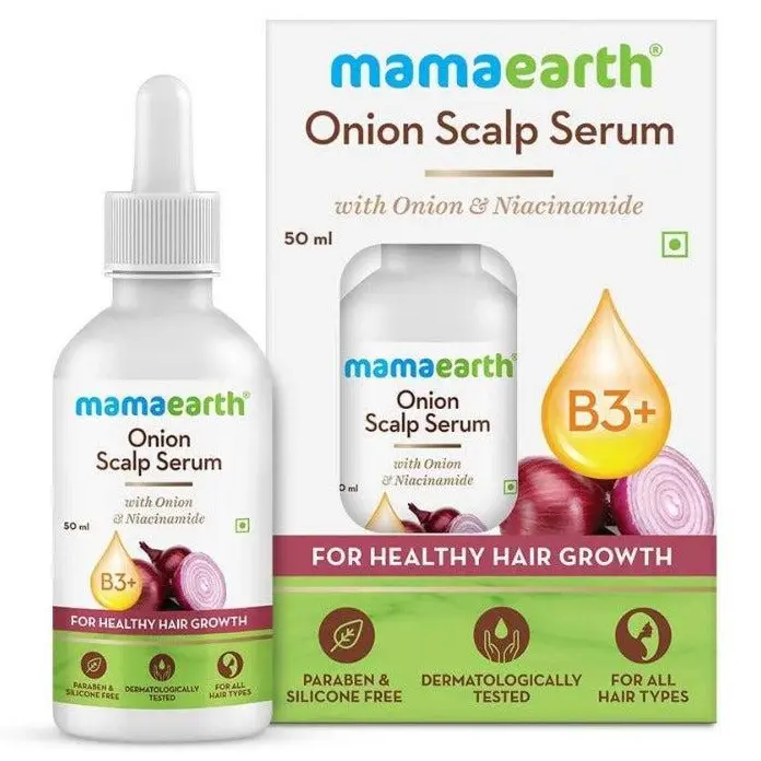 🌿 Mamaearth Onion Scalp Serum for healthy hair growth. Contains Red Onion, Pea Sprouts, Niacinamide, and Aloe Vera Juice. Perfect for all hair types. Dermatologically tested and free from parabens and silicones. Volume: 50ml.