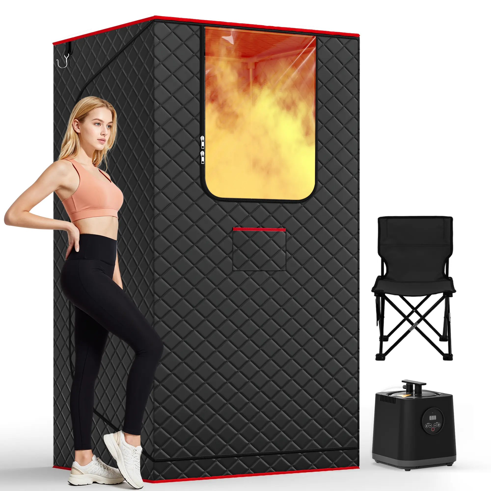 This sauna is great I am pleasantly surprised. Keep the remote handy until you figure it out. Gets hot. Easy set up a big plus. Shipped on time. All 😊