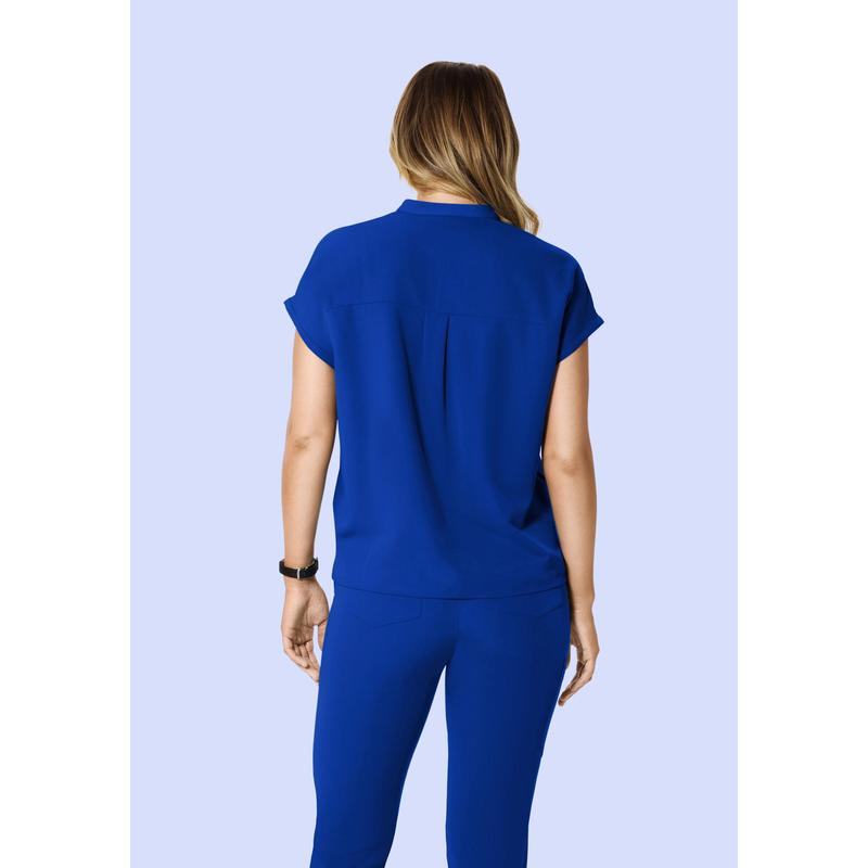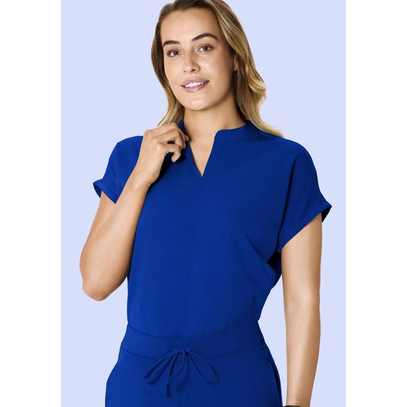 A versatile mandarin dolman scrub top with 4 pockets.