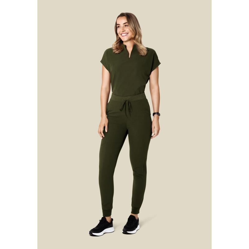A versatile mandarin dolman scrub top with 4 pockets.