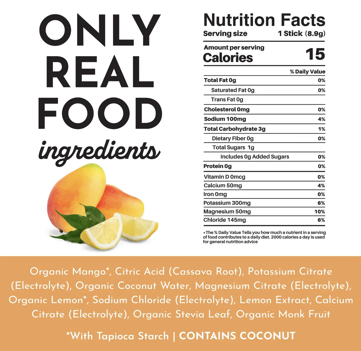 Organic Mango* Citric Acid (Cassava Root) Potassium Citrate (Electrolyte) Organic Coconut Water Magnesium Citrate (Electrolyte) Organic Lemon* Sodium Chloride (Electrolyte) Lemon Extract Calcium Citrate (Electrolyte) Organic Stevia Leaf Organic Monk Fruit *With Tapioca Starch